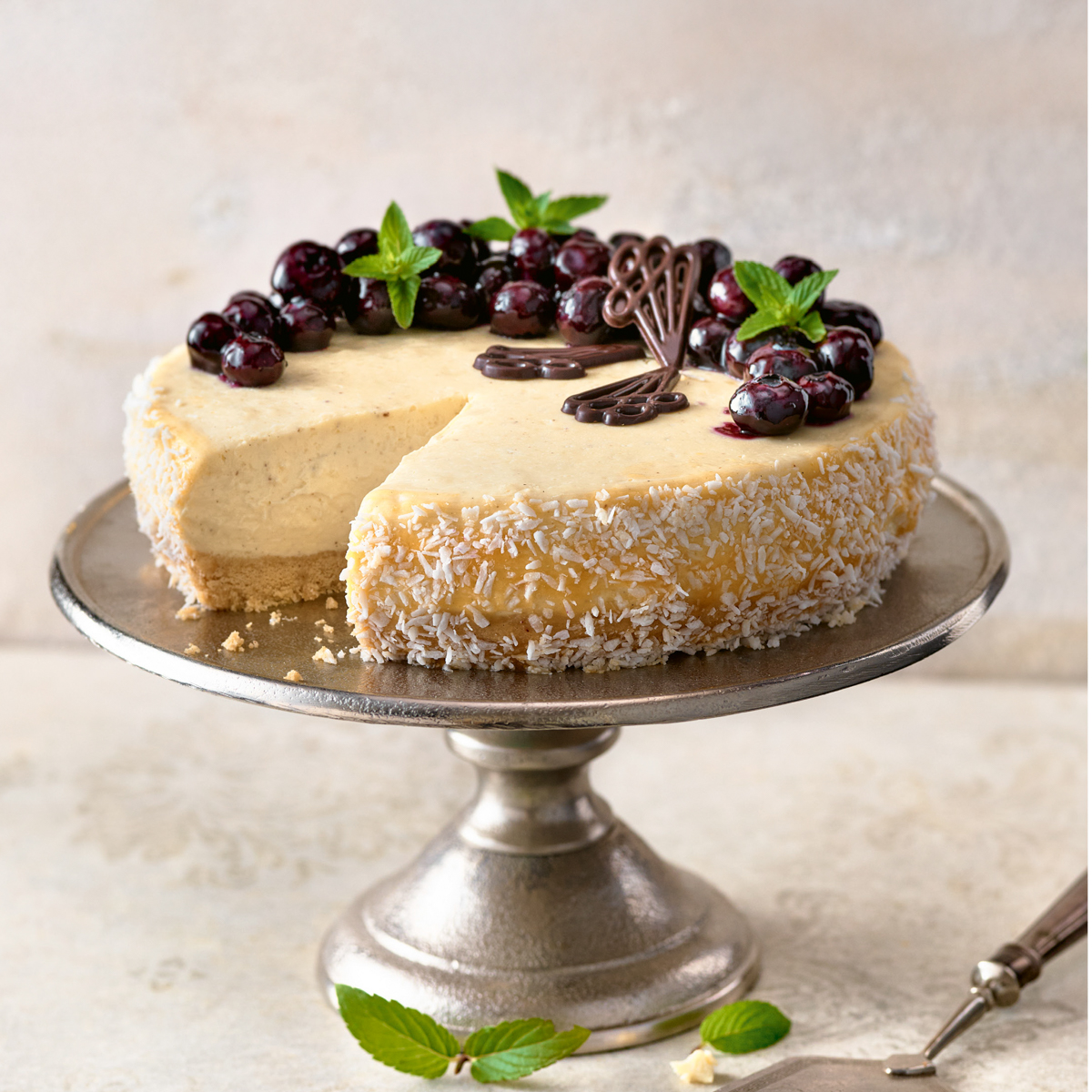 Dieser White Chocolate Cheesecake aus Frischkäse, Schmand und weißer Kuvertüre wird ganz sanft im Ofen gebacken und erhält dadurch seine seidige Textur. Ein knuspriger Keksboden mit Zimt bildet den perfekten Kontrast, während Blaubeeren, Kokosraspeln und ein glänzendes Frucht-Topping für Frische und Farbe sorgen. Besonders praktisch: Die Torte lässt sich hervorragend vorbereiten und schmeckt gut durchgezogen sogar noch besser.