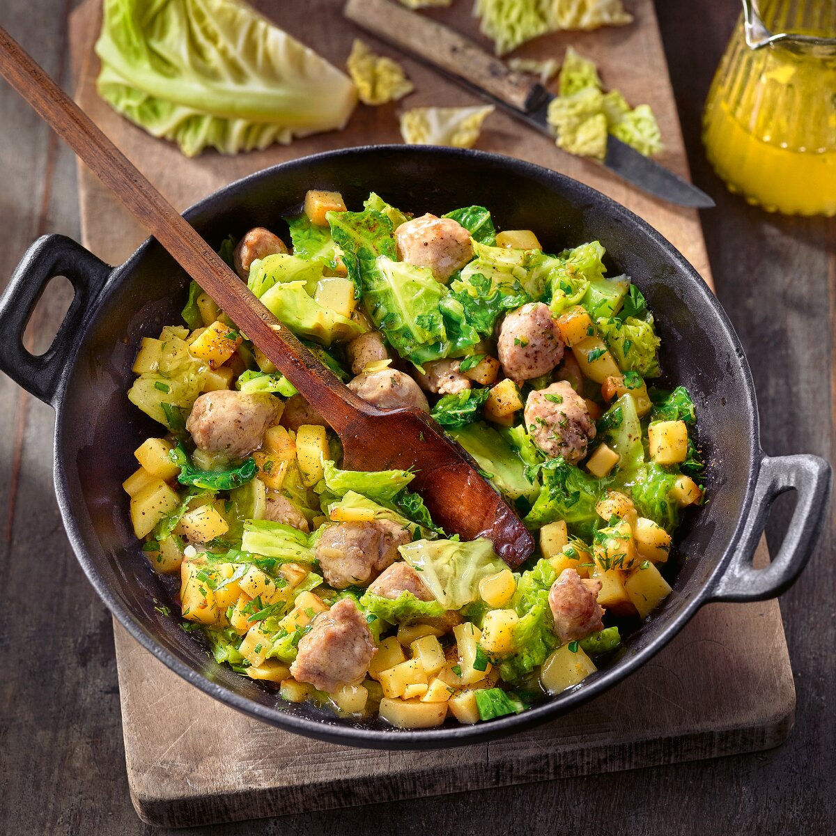 Das finden auch Martina und Moritz und so ist ihr Kochbuch „Kochen mit Martina und Moritz – Schnell + einfach = einfach gut!“ eine Schatztruhe an schnellen Gerichten, die dennoch richtig gut schmecken. So wie dieses wunderbare Wirsinggericht mit Kartoffeln und Bratwurst, das genauso einfach und schnell zubereitet ist, wie es sich anhört. Also am besten nicht lange nachdenken und selber probieren!
