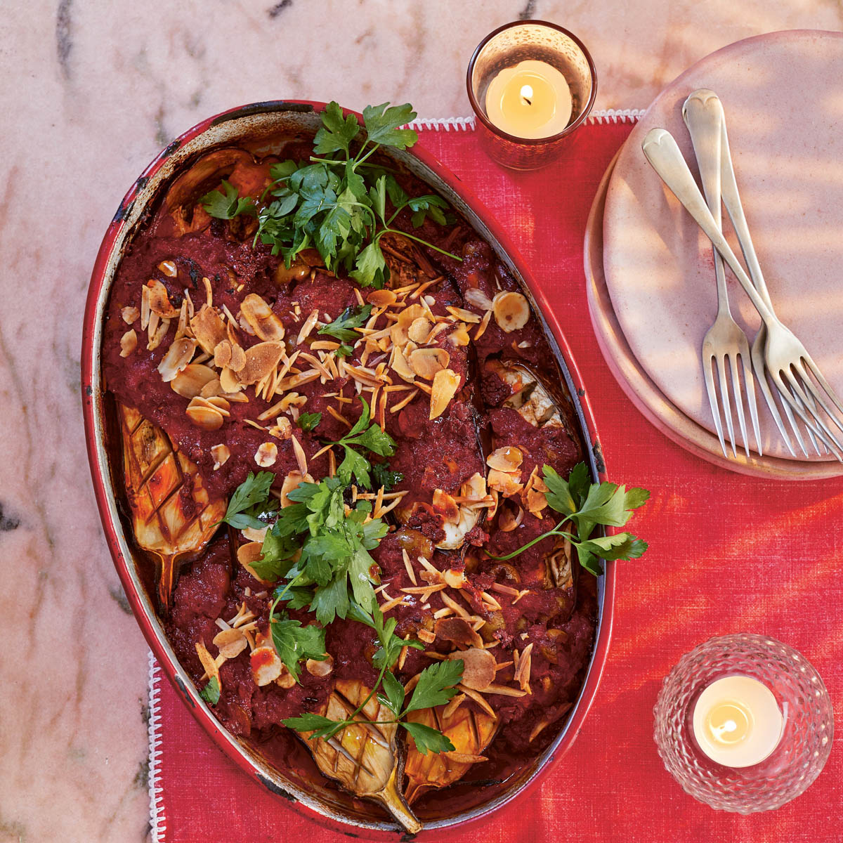 Himmlisch würzige, gebackene Auberginen in einer köstlichen Tomatensoße ist eines der winterlichen Gerichte aus Katy Beskow neuem Kochbuch „Easy Vegan Christmas“. Orientalisch inspiriert werden die Auberginen mit gerösteten Mandeln und einem fantastischem salzigem Zitronenjoghurt serviert. Dazu passen außerdem frische knusprige Brotscheiben perfekt. Egal ob in einer großen oder in mehreren kleinen Formen zubereitet, die würzigen Auberginen sind eine wunderbare vegane Alternative zu klassischen Festtagsgerichten und auch sonst ein absolutes Highlight bei Dinnerpartys.