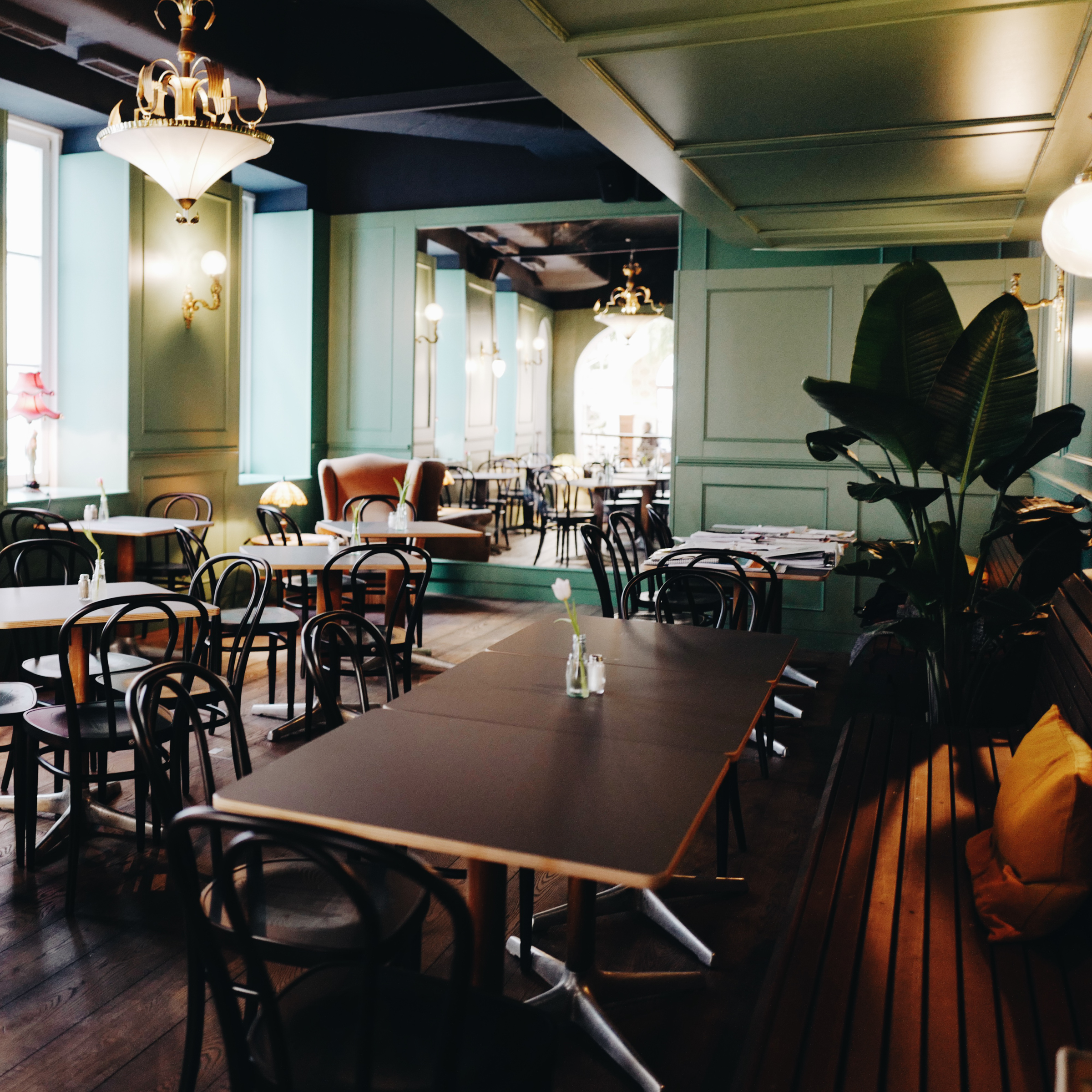 Die Zutaten: Goldenes Licht, kuschelige Samtbänke und grüne Pflanzenpracht. Dazu bemalte Wände, die in fremde Welten mit bunt gefiederten Vögeln und antiken Ruinen entführen.