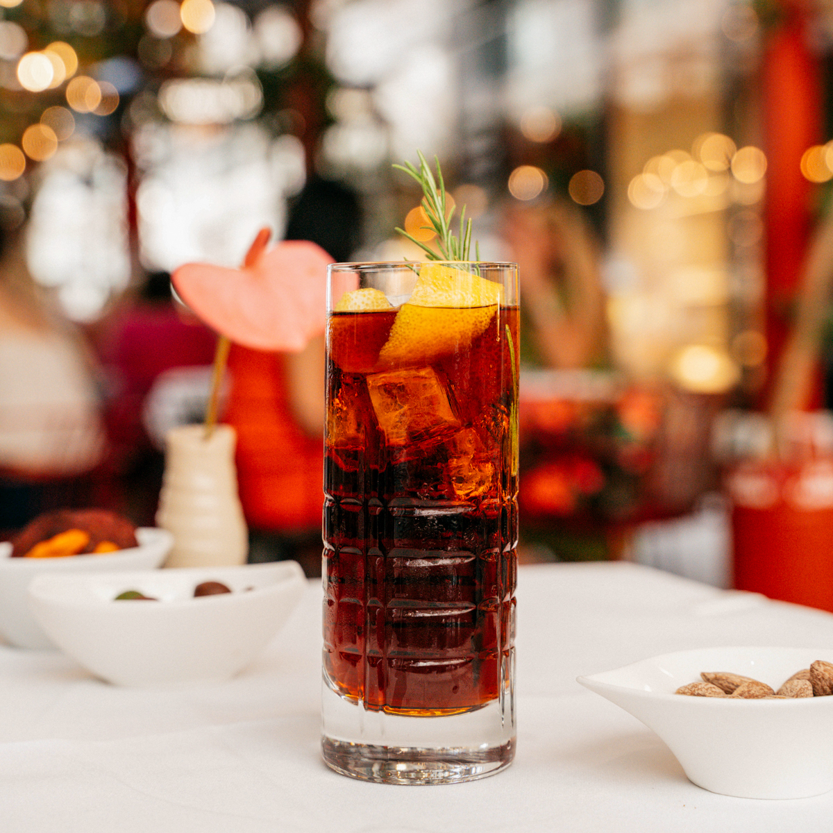 Für unser zweites Getränk verlagern wir uns an die Bar, wo man den elegant in weiß gekleideten Aperitivo-Meister*innen auf die Finger schauen kann. Campari, Wermut, Gin, Kaffir-Limettenblätter und Ingwer: Fertig ist mein Oriental Negroni.
