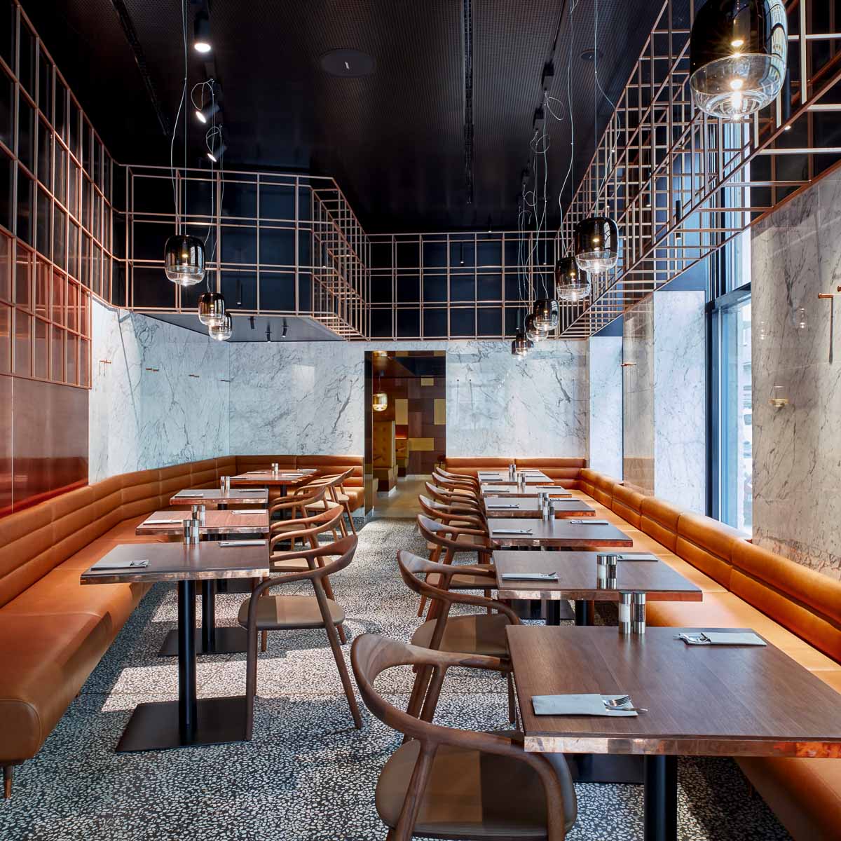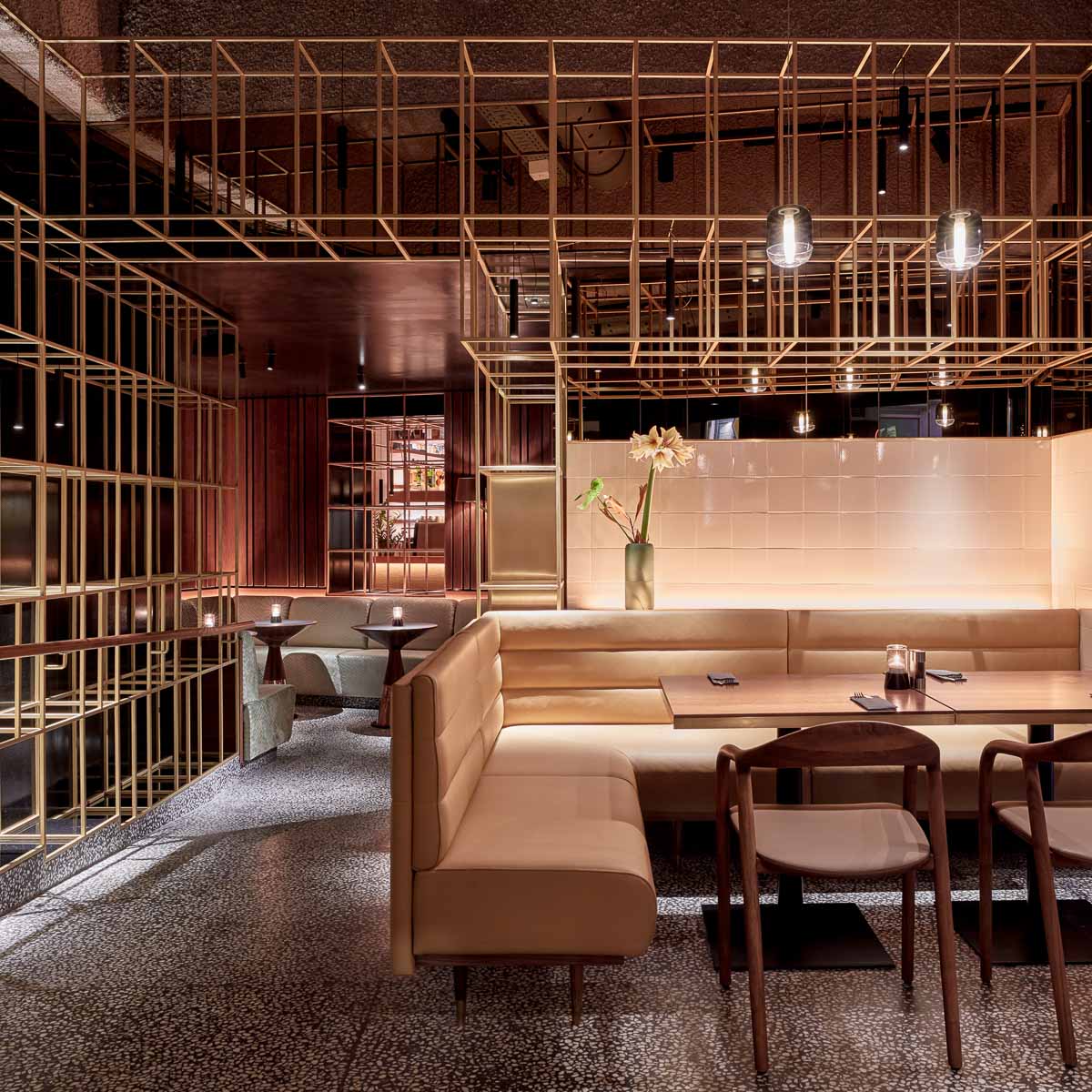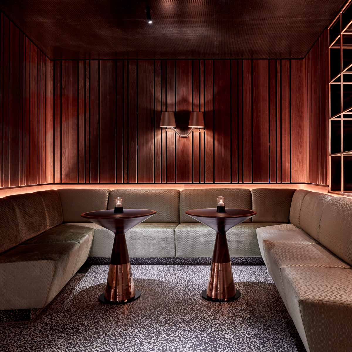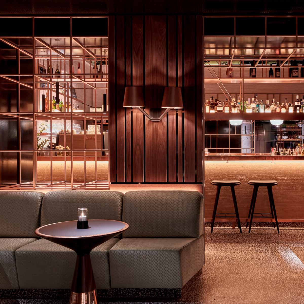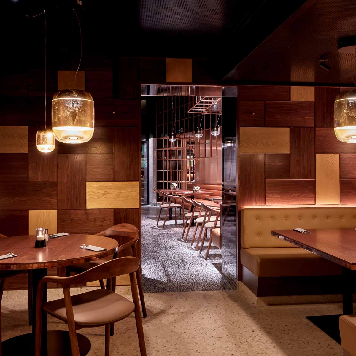 Das Bistro Porto gehört zum neuen Zubau des beliebten Das Triest-Hotel am Rilkeplatz im Wiener Freihausviertel und besticht mit diskretem 60er-Jahr Ambiente: elegante Metallstreben in Kupfer und Messing als horizontale und vertikale Raumteiler, Holz getäfelte Wände, weißer Marmor, braunes Leder, grüner Samt, Teakholz-Möbel, gedämpftes Licht – Midcentury-Referenzen, wohin das Auge reicht.