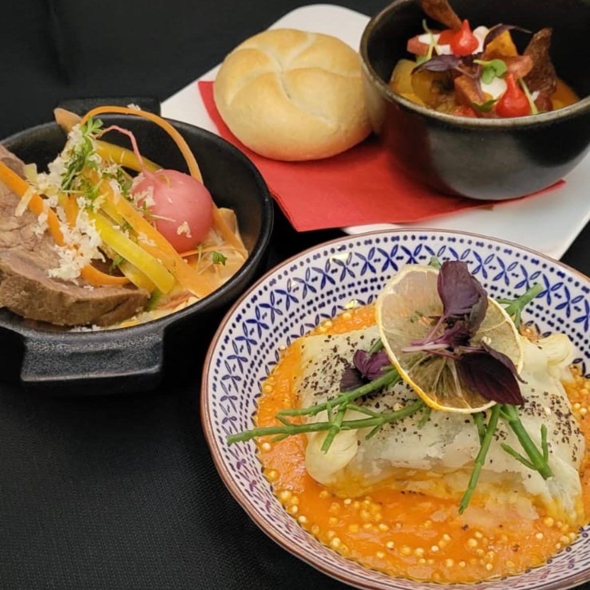 Das Lokal liegt in einem charmanten Souterrain-Raum mit weißgetünchten, gewölbten Decken. Auf der Karte stehen österreichische Klassiker – von Daniel nach eigenem Gusto modernisiert – und saisonale Kreationen. Wer kleinen Hunger mitbringt, ist mit drei „Schmankerl“ (19,50 Euro) gut bedient. Wer in größerer Runde kommt, kann einfach die ganze Karte bestellen (sieben Tellerchen gibt es für 45,50 Euro).