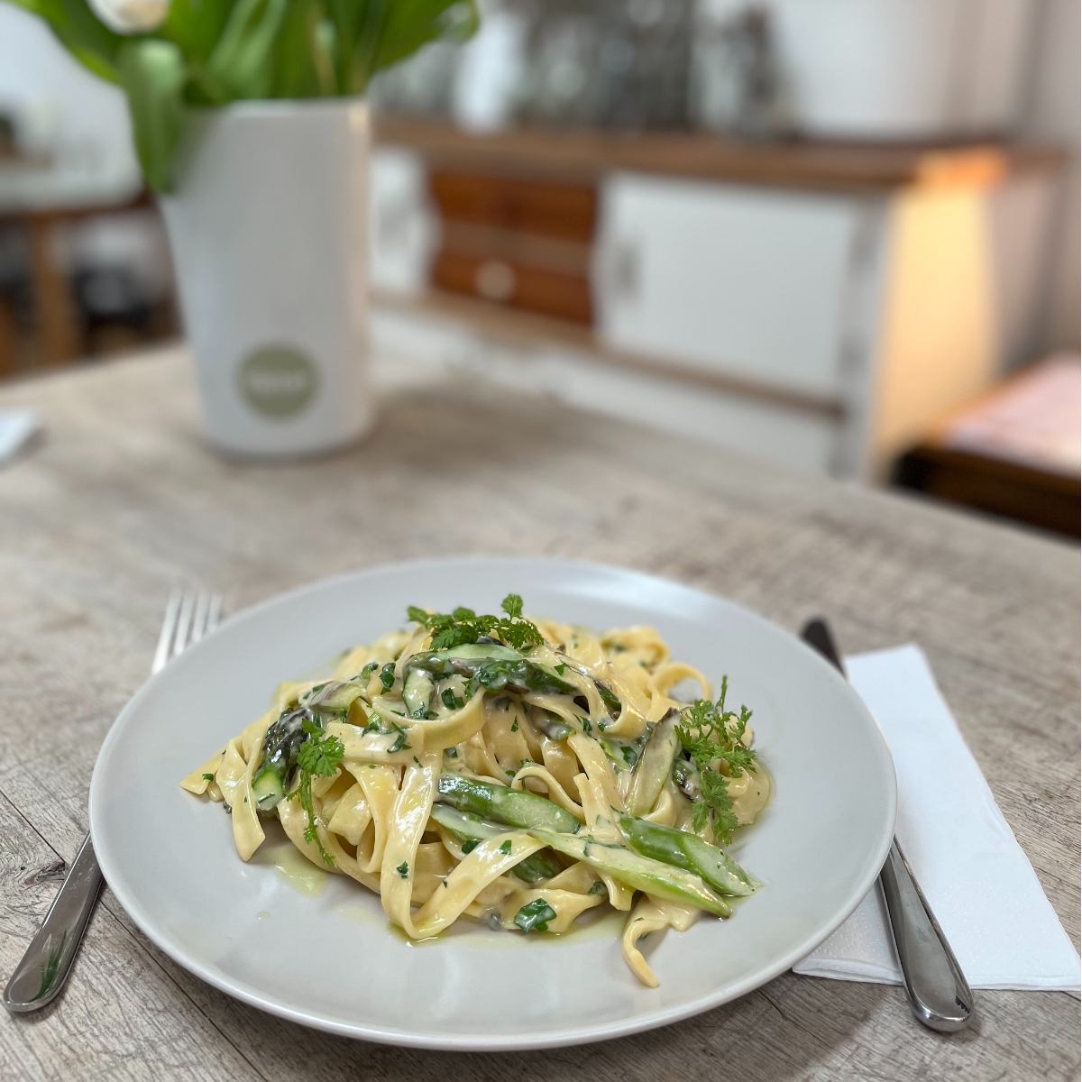 Wie zu Hause bei Oma steht pünktlich ab halb 12 das Mittagessen auf dem Tisch: Saisonale Wohlfühlgerichte wie Spargel-Risotto oder cremige Schinkenfleckerl. Man schmeckt die jahrelange Erfahrung und die Leidenschaft, die Lukas Reiter für seinen Beruf mitbringt. Die Liebe zum Kochen stammt – wie sollte es anders sein – von Uroma Philomena und Oma Rotraud, von denen der kleinen Lukas seine ersten Rezepte lernte.