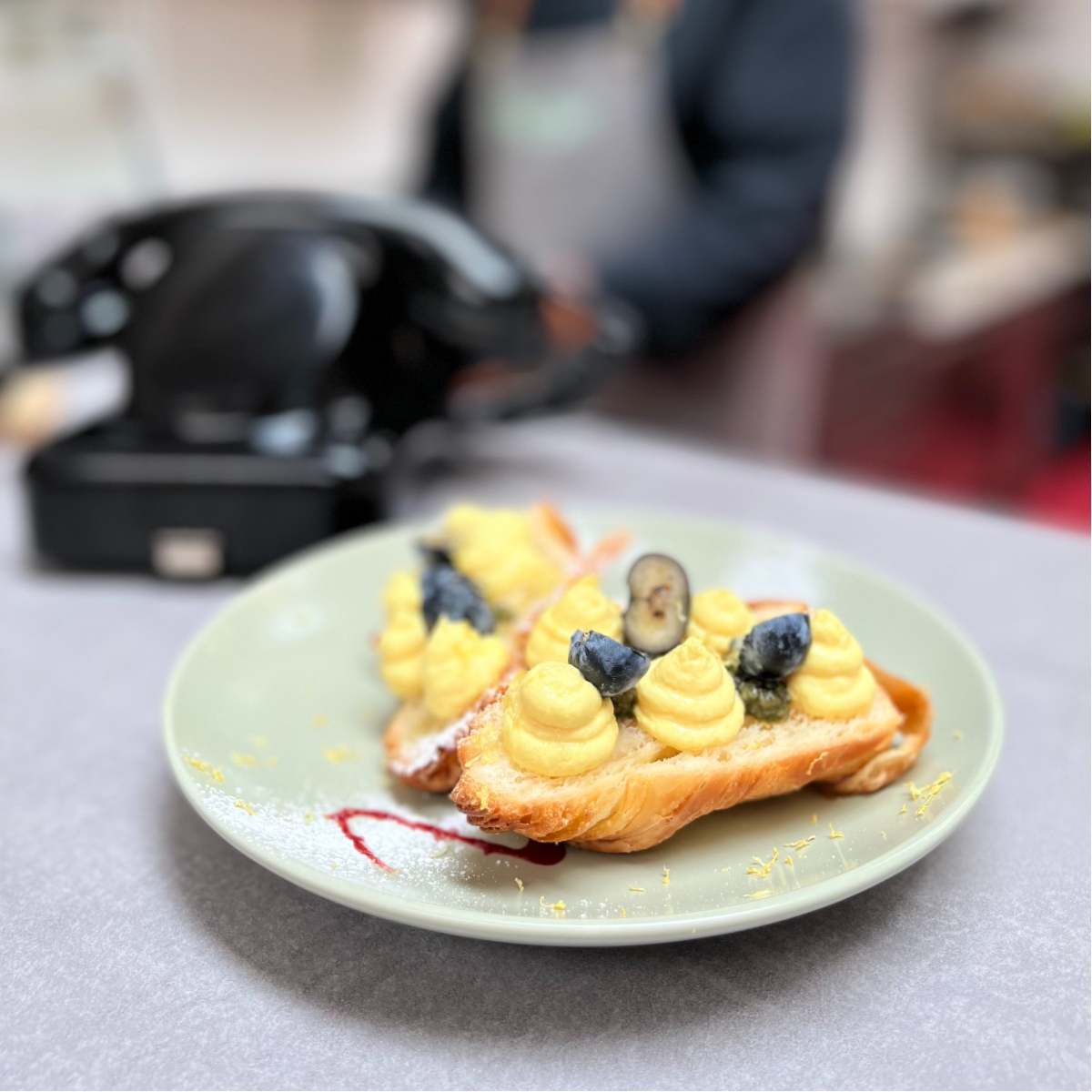 Das Menü umfasst alles, was das Frühstücks-Herz begehrt. Und noch viel mehr: Ein Stundenei etwa – cremig wie eine Praline, da sous vide gegart – mit Kartoffelschaum, Pumpernickel-Crunch und würzigen Käseraspeln der Belper Knolle. Eine weitere Entdeckung ist der mit Kakao angemachte Schoko-Hummus, wozu saftiges Brot der stadtbekannten Bio-Bäckerei Öfferl gereicht wird. Von dort kommen auch süße Teilchen wie Cruffins, die bei Familie Reiter mit Zitronen-Topfen-Creme serviert werden.