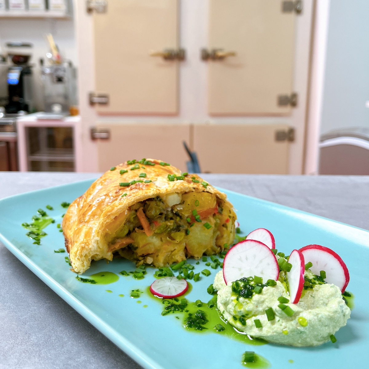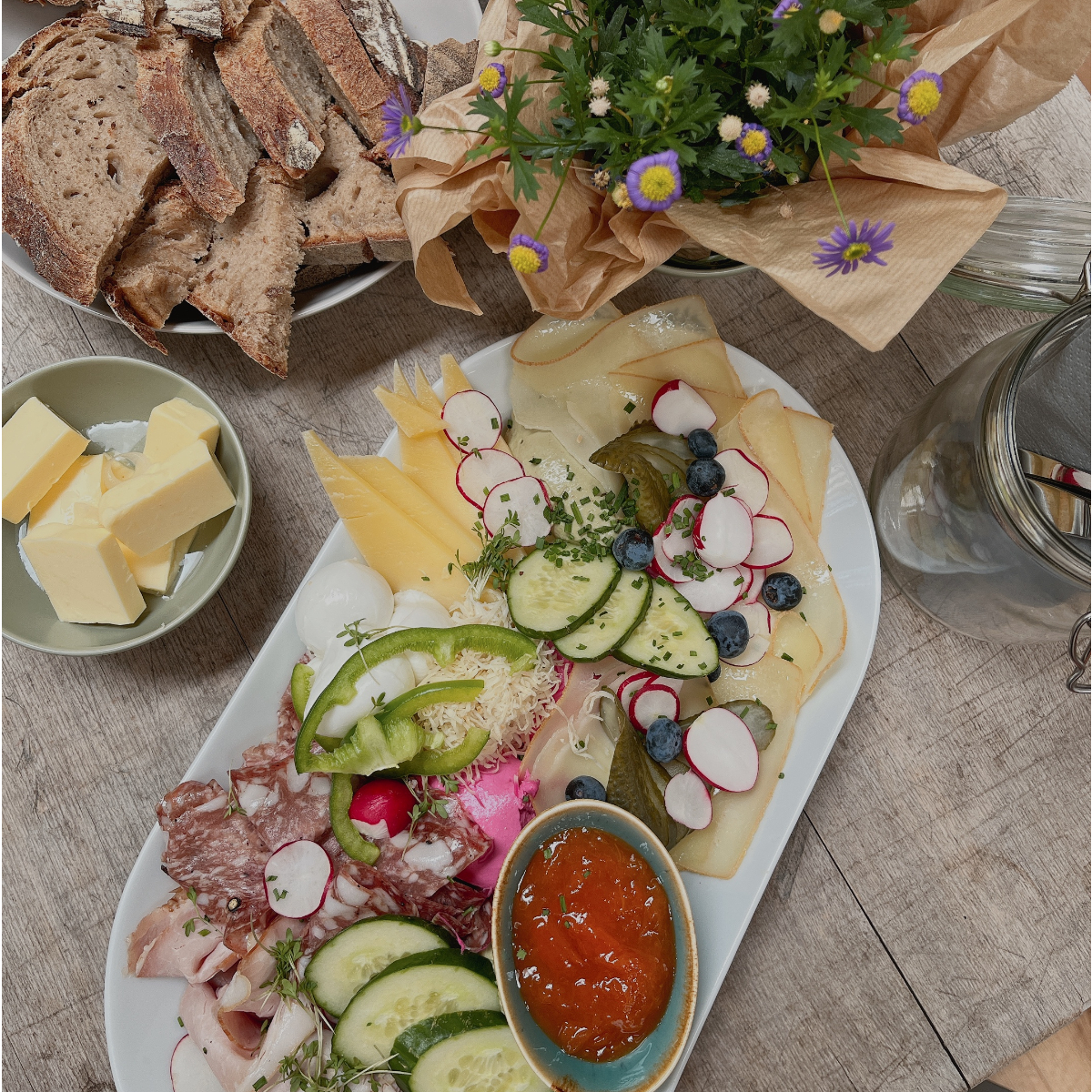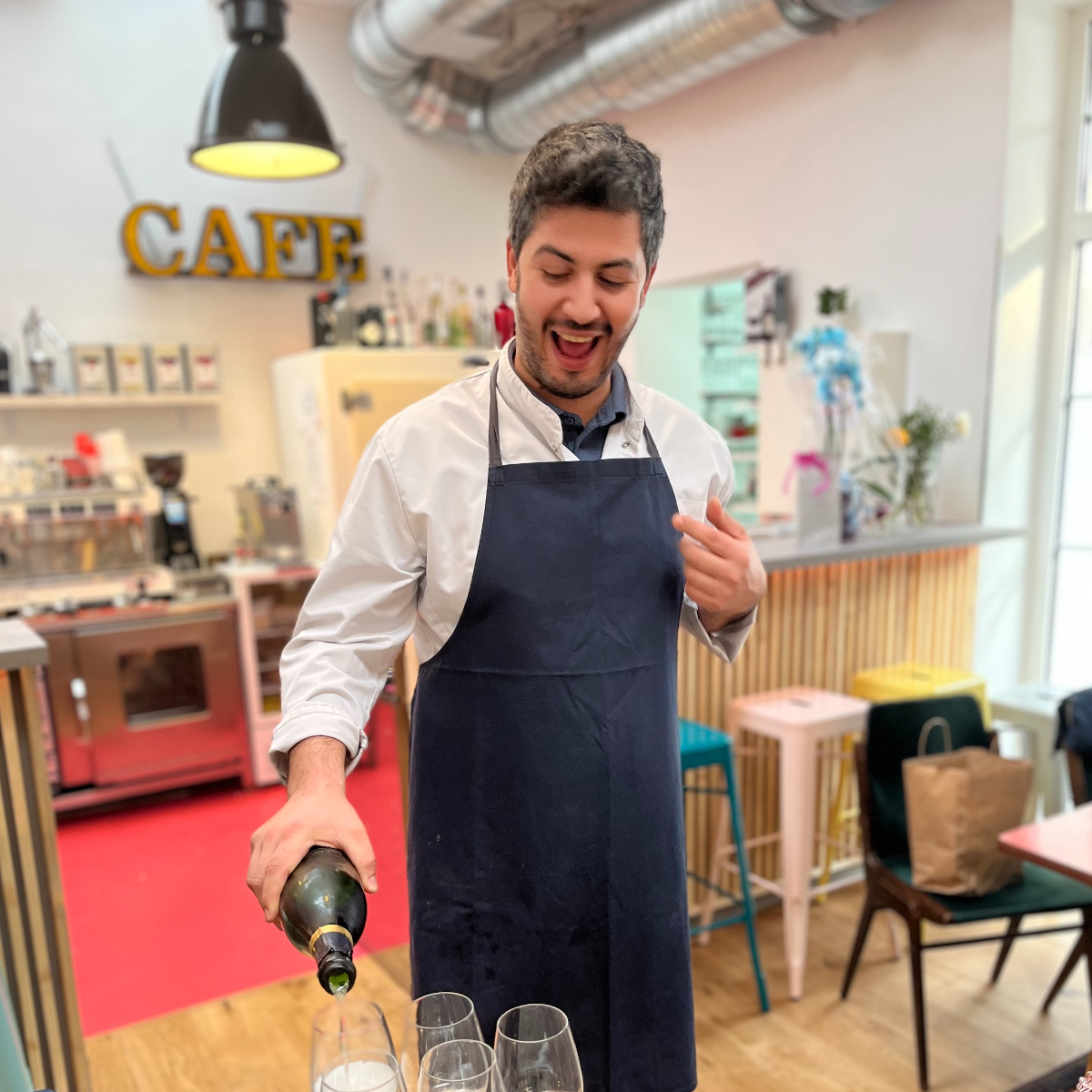 Als Marlies dann auch noch dazu aufruft, die Tische nach Lust und Laune umherzurücken oder sich für den süßen Gang in die Sofa-Ecke zu begeben, fühlt man sich wahrlich, als wäre man im heimischen Wohnzimmer. Der Unterschied ist nur, dass man sich hier bequem zurücklehnen kann, während Lukas Reiter süße und herzhafte Leckereien zaubert. Gekocht wird saisonal, aus Zutaten, die von Bio-Landwirt*innen und heimischen Betrieben stammen.