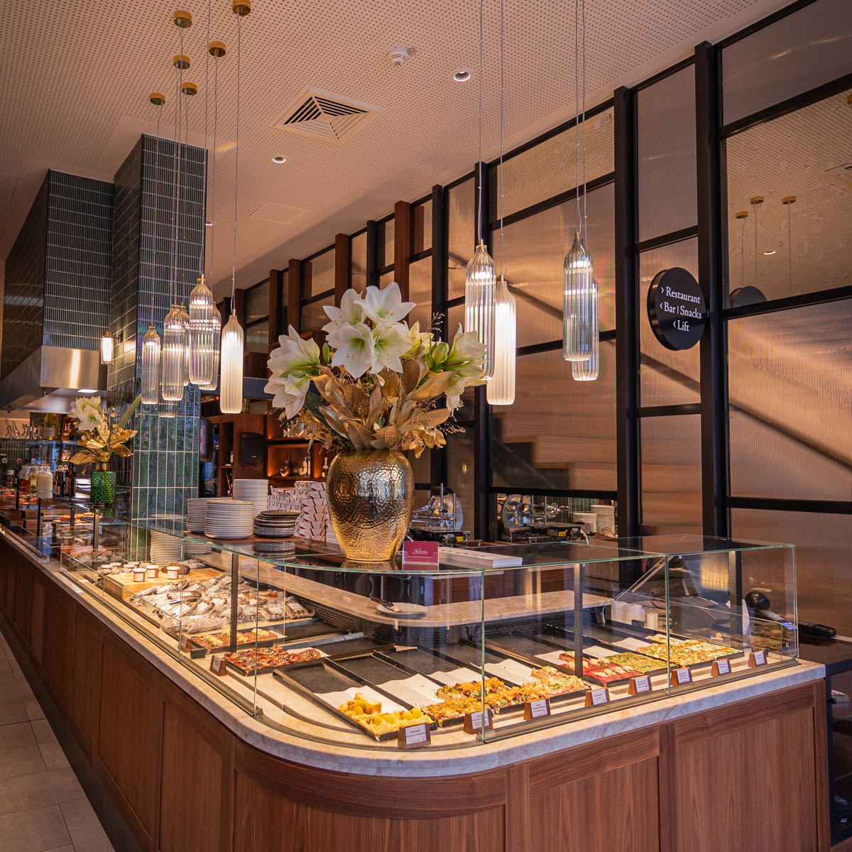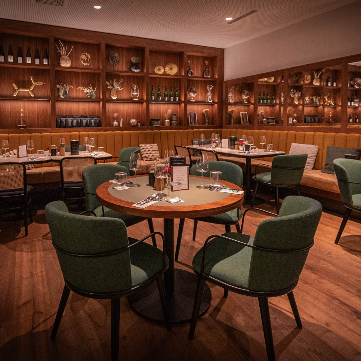 Zum Hausbrot gibt es Wildschweinverhackertes und zum Rote Rüben Carpaccio (ein wenig Gemüse muss sein), gebratene Feigen und cremige Erbsenguacamole. Wer mag, kann sich auch belegte Schnitten aus der Vitrine im Erdgeschoss bestellen: Auf frisch gebackenem Joseph Brot stehen dort allerhand farbenfrohe Toppings zur Auswahl – von vegetarisch-vegan bis Fisch und Fleisch.
