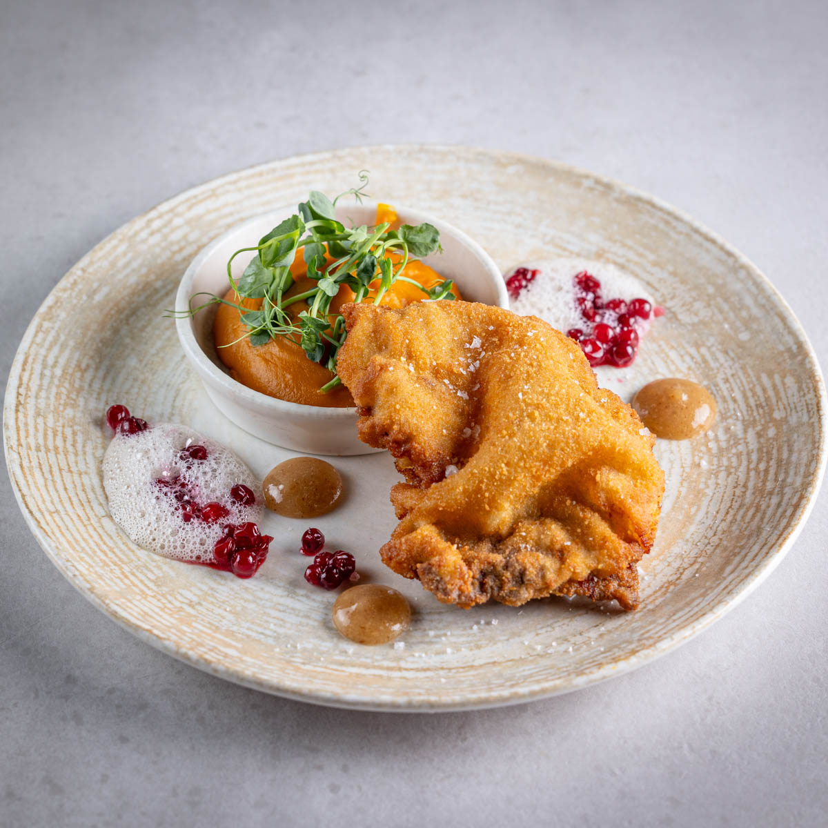 Die perfekte Begleitung zu den deftigen Hauptgängen: Zart geschmortes Gulasch, knusprige Spanferkelstelze, Gans mit feinem Gratin. Letztere ist von der kleinen saisonalen Karte, die das Menü ergänzt.