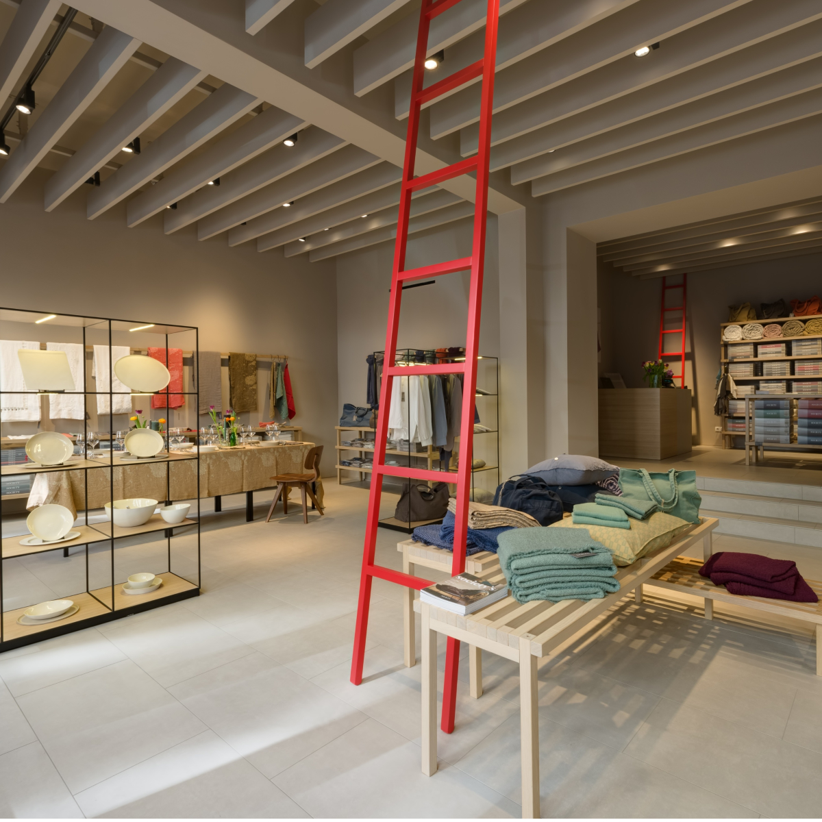 Wie bei allen bisherigen Geschäften erarbeitete auch in Wien der Architekt Ferruccio Laviani das kreative Konzept: eine wesentliche Struktur mit natürlichen Farben und Materialien, die die Stoffe betonen, denn genau diese sind die echten Protagonisten des Raumes und der über 100-jährigen Firmengeschichte.