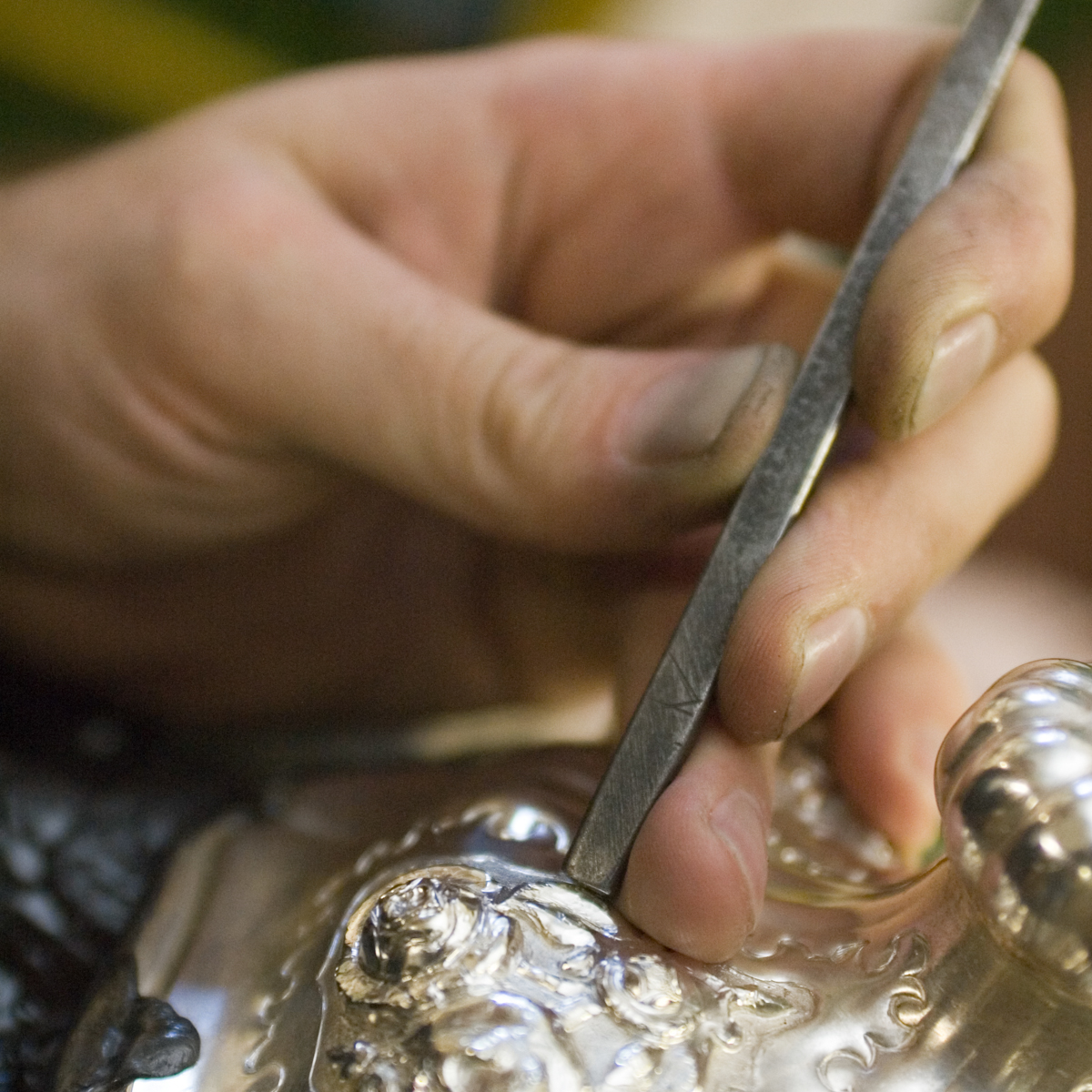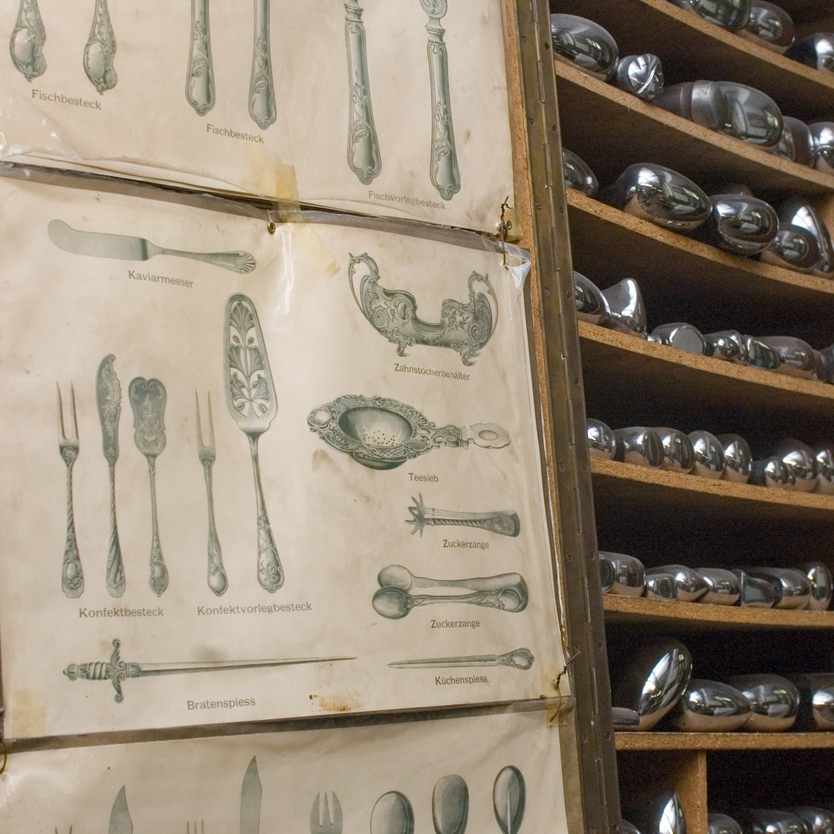 Dort liegt der Geruch von poliertem Silber, Feilstaub und Öl in der Luft; schwere Ambosse und historische Pressen sind Zeitzeugen von den Anfängen der Manufaktur.