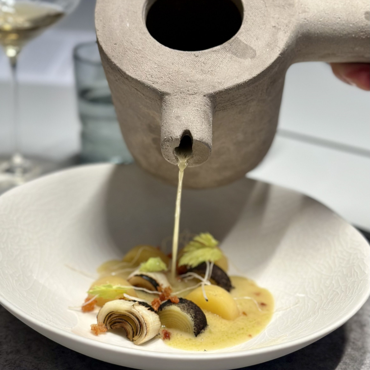 Aus Italien gibt es eine wärmende Ribollita mit Schwarzkohl und – gemäß dem Dreiklang Fisch, Fleisch, Vegetarisch – aus dem Wasser ein zartrosa Lachsfilet. Das Risotto cremig, der Lachs zart, die Haut kross. Besser hat man bei einem Parlamentsbesuch wohl nie gegessen.