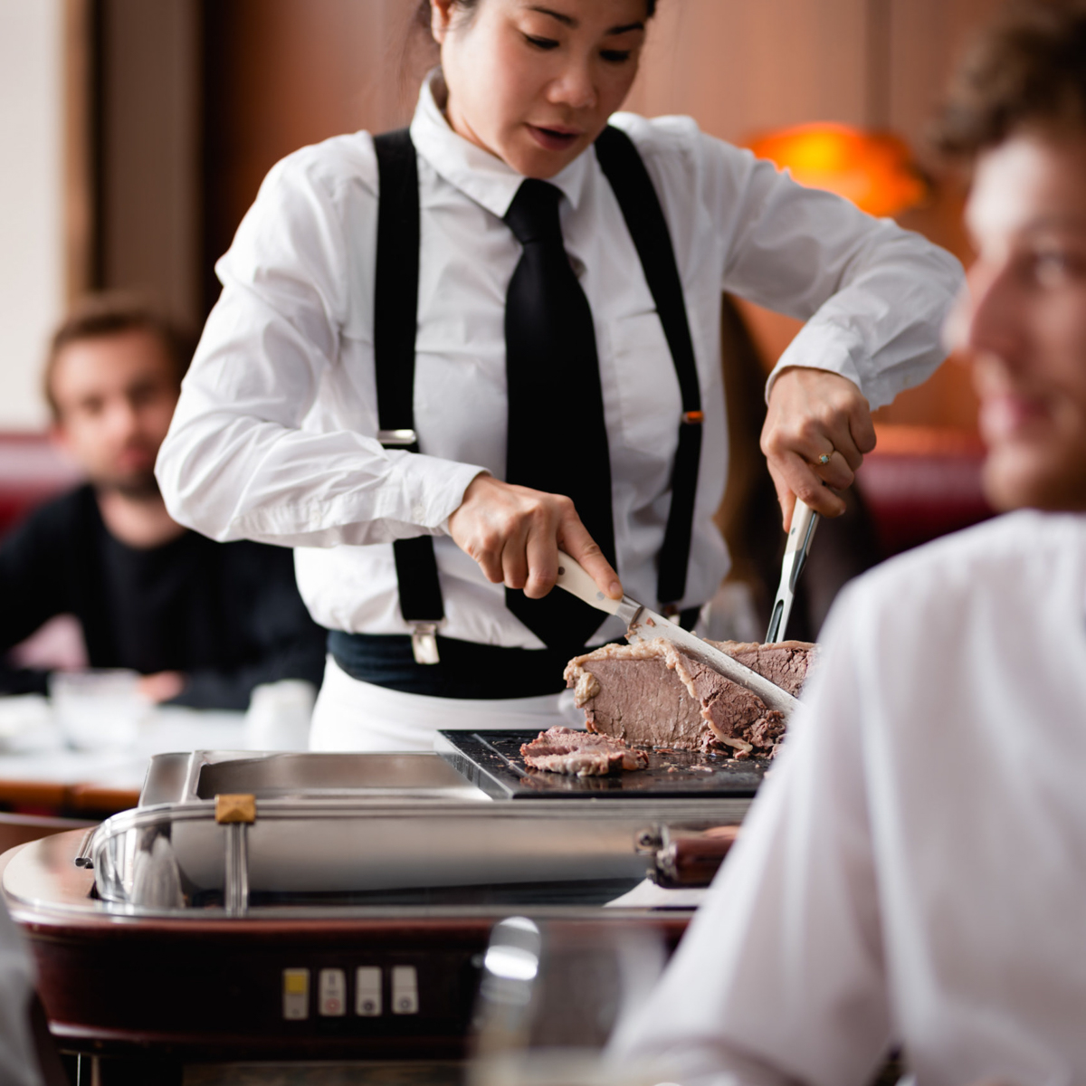 Beim Blick auf die Nachbartische aber, an denen schon – begleitet von genießerischen Mmmhs und Oohs, die goldbraunen, tellergroßen Schnitzel genossen werden – begnügen wir uns mit einer bescheidenen Auswahl. Die Karte liest sich wie ein Best-Of der Altwiener Küchenklassiker: Geröstete Rindsleber, Fleischlaibchen nach Art von Fürst Metternich und natürlich Tafelspitz. Der wird hier – ebenfalls ein Erlebnis – vom Wagen serviert und vor den Augen der Gäste nach Wunsch aufgeschnitten.