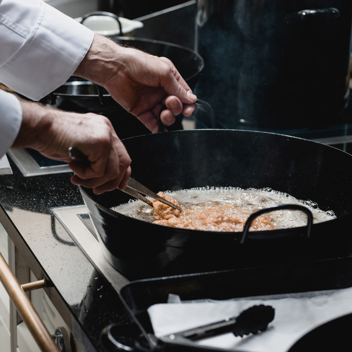 Die Qualität eines Schnitzels erkennt man an der welligen Panade. Soufflieren lautet das Zauberwert: Während das Schnitzel in der heißen Pfanne schwimmt und immer wieder mit Fett benetzt wird, bilden sich filigrane Luftkammern, die die Panade nach oben treiben.