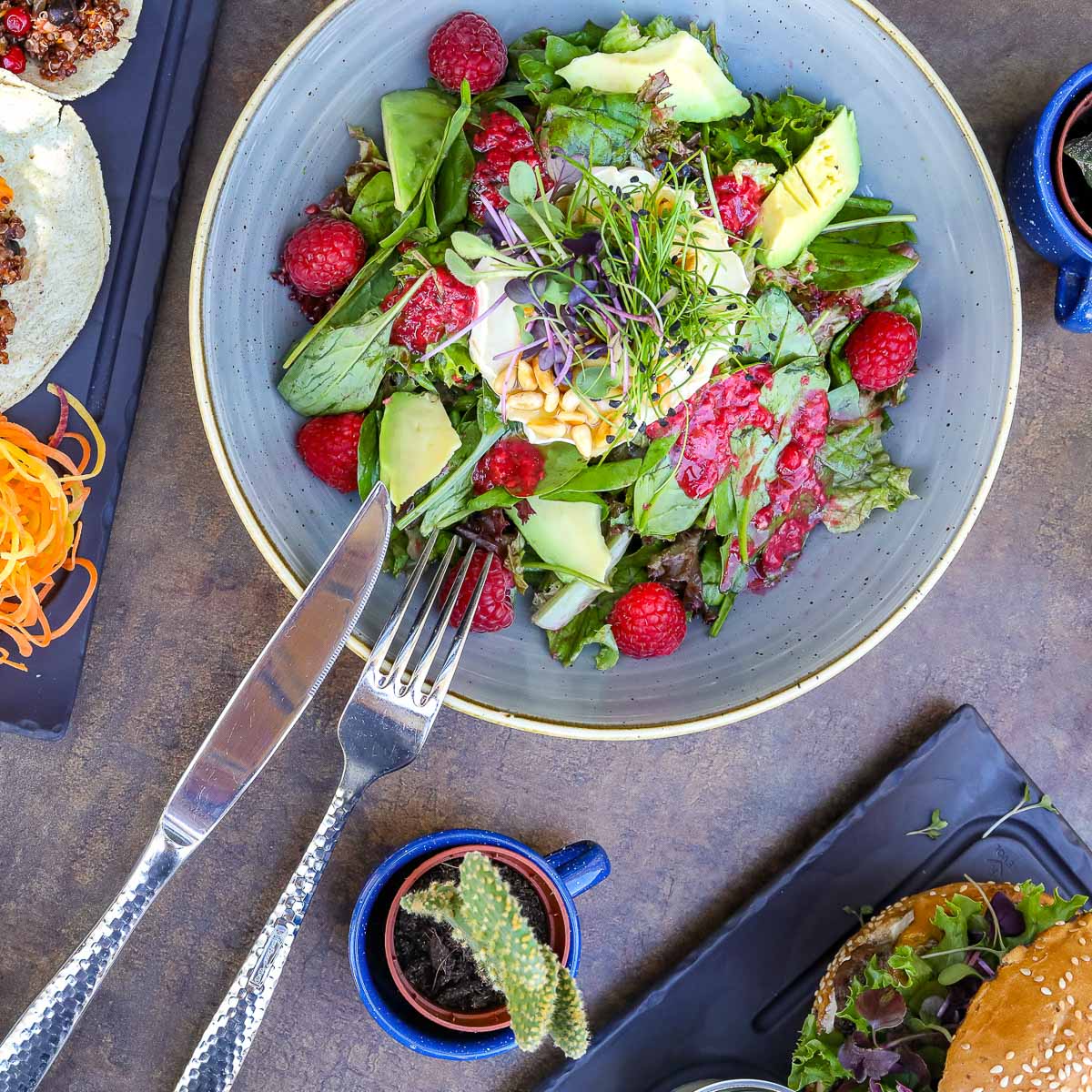 Die eher industrielle Einrichtung mit hier und da dezenten Querverweisen auf die mexikanische Kultur mag austauschbar sein, ist aber zeitgemäß und verzichtet bewusst auf den üblichen, ikonographischen Kitsch. Was an den Wänden an Farbe fehlt, findet sich im Santos ohnehin auf den Tellern.
