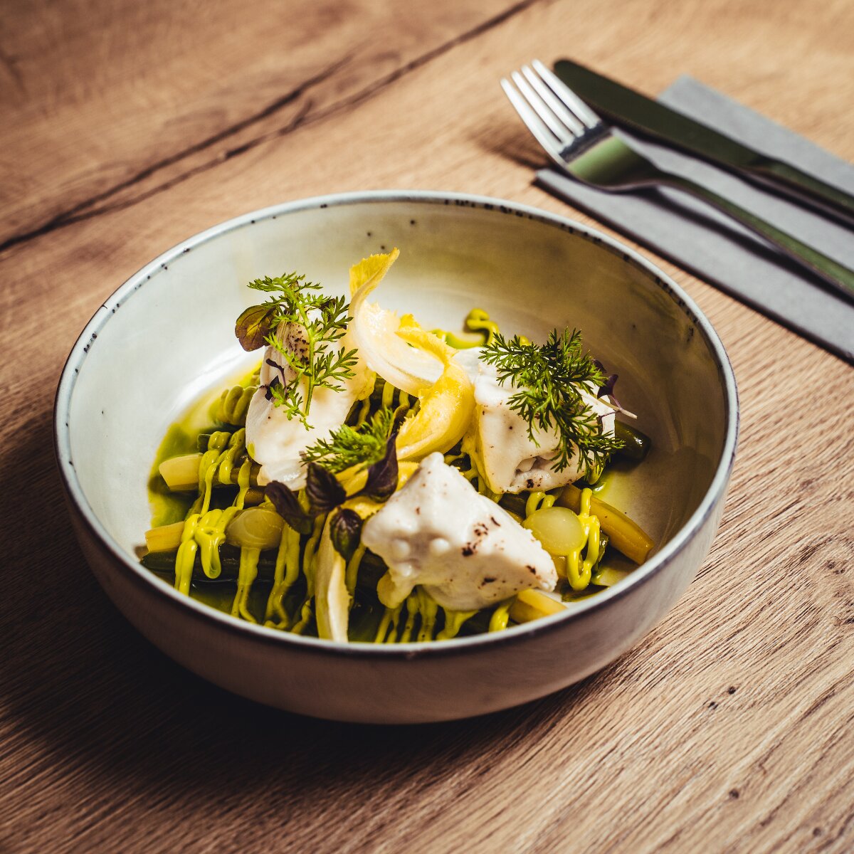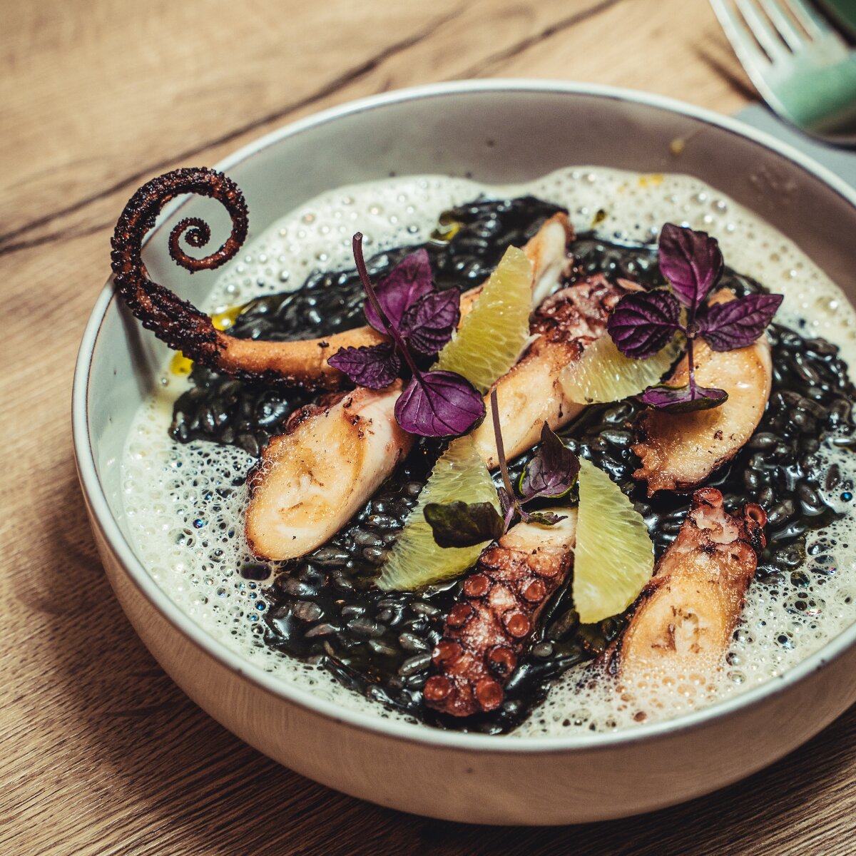 Küchenchef Daniel Hoffmeister, der zuvor in zahlreichen haubengekrönten Lokalen gekocht hat, zaubert raffinierte Gerichte, die schlicht, aber immer mit besonderem Twist daherkommen. Ein Beispiel aus dem letzten Sommer (das ich mir gleich für meine eigene Küche abgeschaut habe): Den Klassiker Tomate-Mozzarella servierte das Team mit Wassermelone – in Form von gefrorener Granita. Statt Mozzarella verwendeten sie die ungleich cremigere Burrata, die Paradeiser waren confiert und der Schnittlauch kam nicht einfach gehackt, sondern als feines Öl darüber.