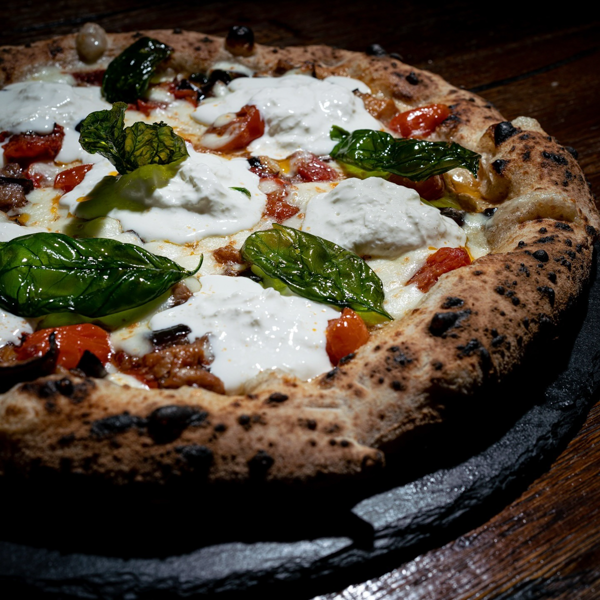 Die „Nero di Marinara“ hebt sich von klassischen Varianten durch ihre Intensität und Finesse ab. Die süßlich-fruchtigen Datterino-Tomatenfilets, in der Pfanne angebraten, geben der Pizza eine tiefe, fast karamellisierte Note. Der Knoblauch aus Voghiera – für sein besonders mildes, zugleich aber würziges Aroma bekannt – verleiht dem Ganzen eine elegante Schärfe. Abgerundet wird alles durch das intensive, leicht herbe Oregano-Aroma, das von den Bergen Süditaliens stammt und dem Belag eine unverkennbare Frische gibt.