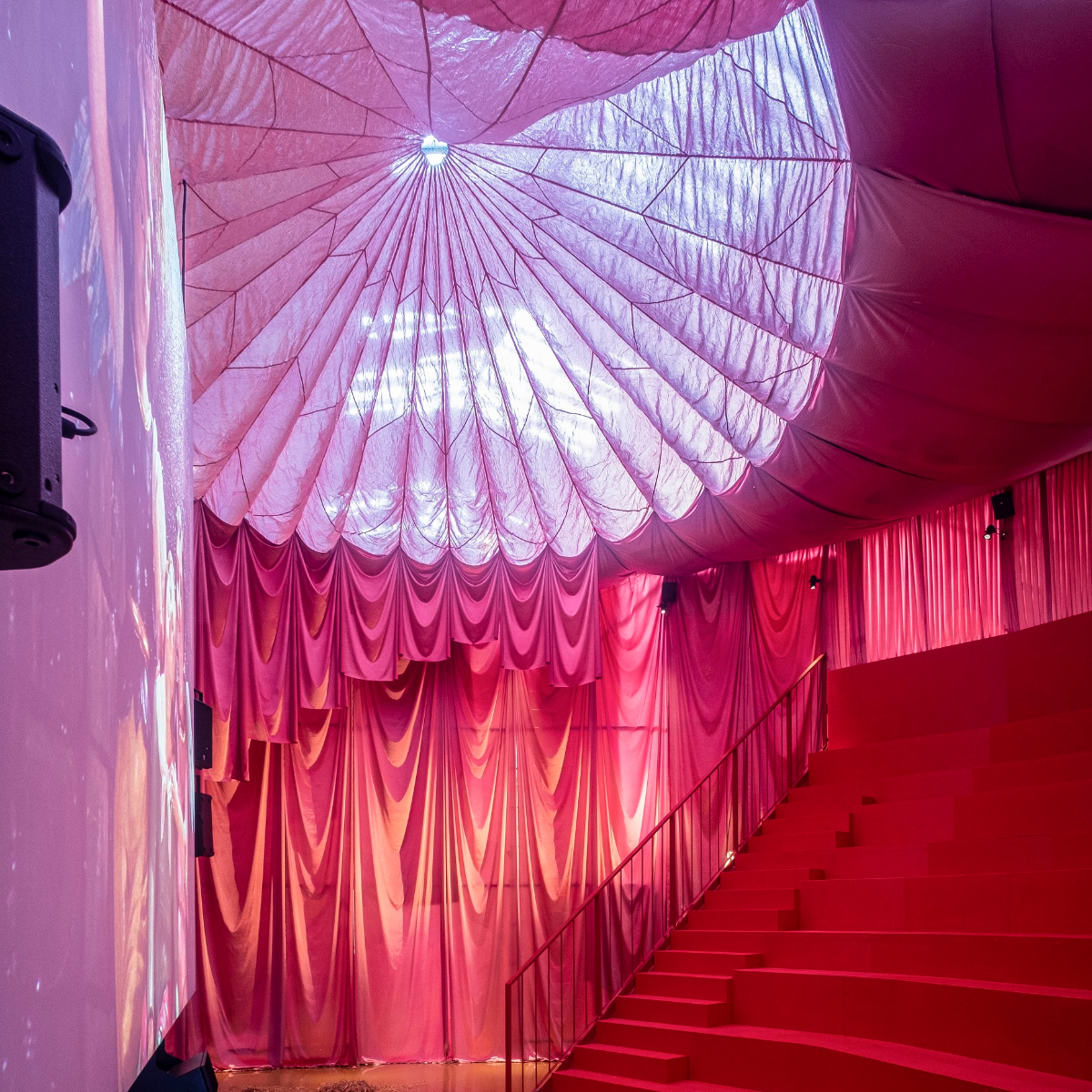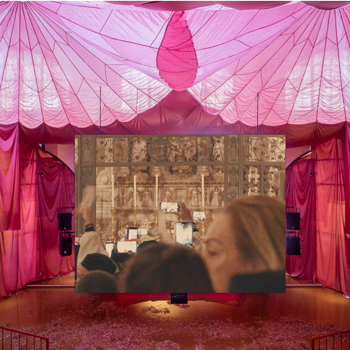 Und tatsächlich finden sich die Besucher in einem Zirkuszelt wieder, das um ein Amphitheater herum aufgebaut wurde. Das Licht im Raum schimmert rosa und auf dem Boden vor der Leinwand liegt Konfetti. Jardin, die dafür bekannt ist, in ihrer Arbeit gerne altertümliche Bräuche oder Mythen aufzugreifen, tut dies auch in “Fat to Ashes“, indem sie in drei filmischen Momentaufnahmen ein sizilianisches religiöses Fest zu Ehren der heiligen Agatha, die traditionelle Schlachtung eines Schweins und den Kölner Karneval miteinander verschmelzen, aber auch aufeinanderprallen lässt.