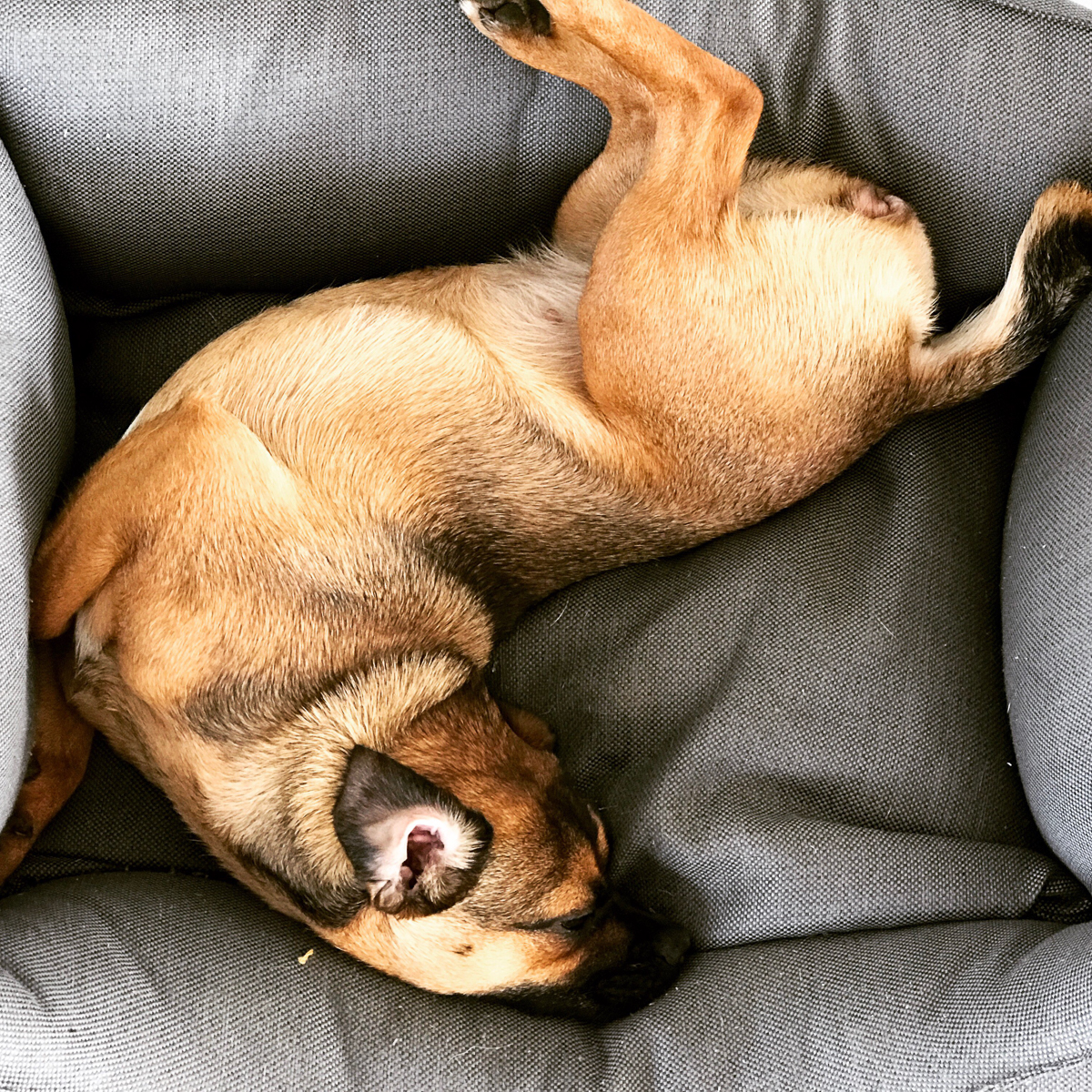 Nach einem anstrengenden Tag oder einem langen Spaziergang ist sie meistens komplett erledigt. Dann schafft sie Zuhause gerade noch so den Weg in ihr Körbchen, aber sobald sie dort angekommen ist, geht gar nichts mehr. Sie liegt halb drin, halb draußen, völlig egal. Hauptsache liegen und schlafen. Man könnte meinen, sie wurde einfach bewusstlos irgendwo liegen gelassen. Ein bisschen so wie ich im Urlaubsmodus.