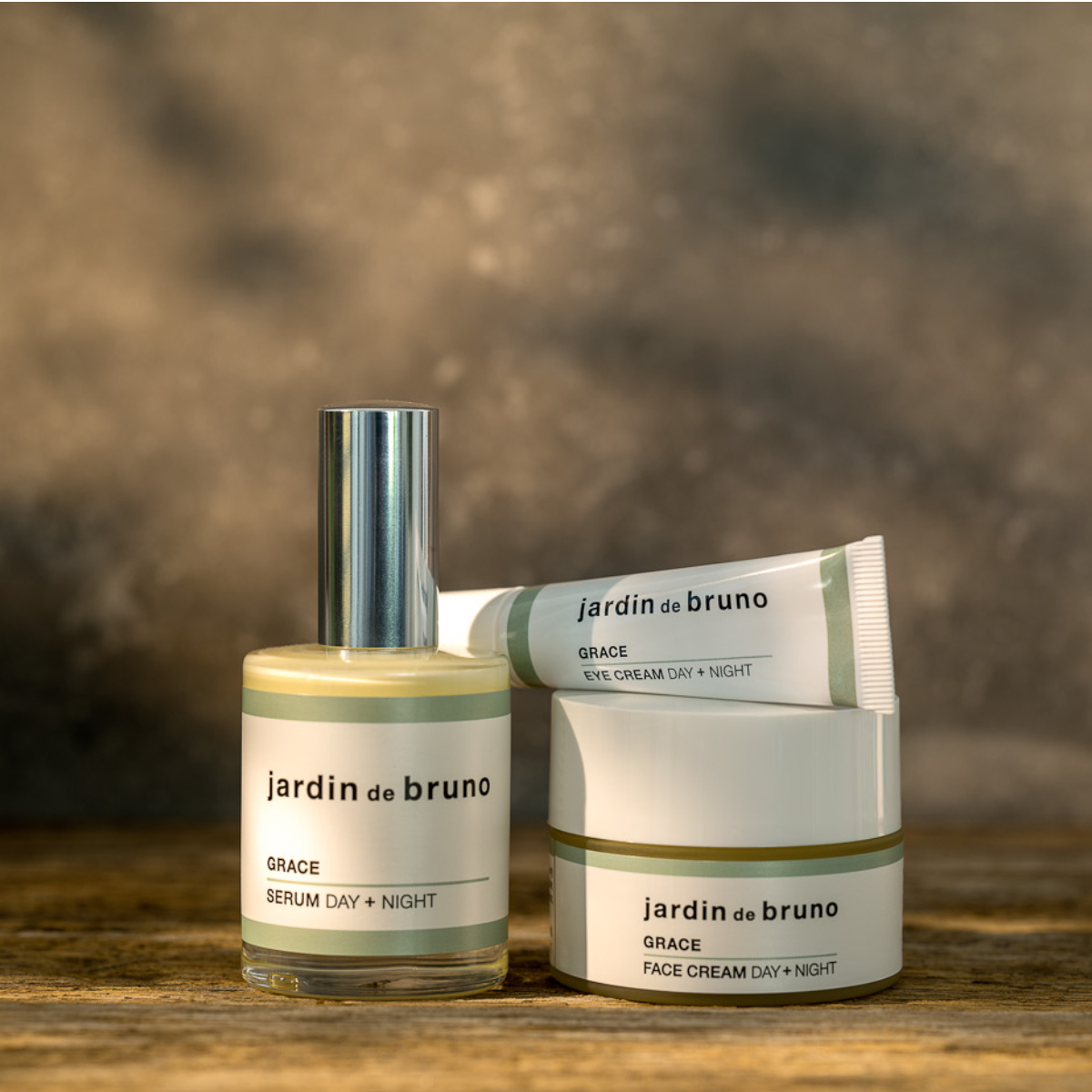 Verena Schulze weiß, dass ihr Vater nicht nur über diese enorme Expertise verfügt, sondern eigentlich auch noch Lust auf Neues hat. Eines Tages beschließen sie, gemeinsam etwas zu entwickeln. 2018 gründen beide das Label Jardin de Bruno. Bruno Schulze ist dabei dank seiner mannigfachen Kenntnisse über die Kräfte der Botanik Ideengeber und Sparring-Partner seiner Tochter. Gemeinsam haben sie es geschafft, eine Pflege zu kreieren, die gänzlich durch die Kräfte der Natur wirkt. Die Grace-Serie umfasst das wunderbare Serum, eine Augencreme sowie eine Gesichtscreme und ist von Grace Kelly und deren Anmut inspiriert. „Sie hatte immer so wunderschöne gepflegte Haut und war auch mit weit über 40 Jahren noch immer wunderschön“, schwärmt Verena Schulze.