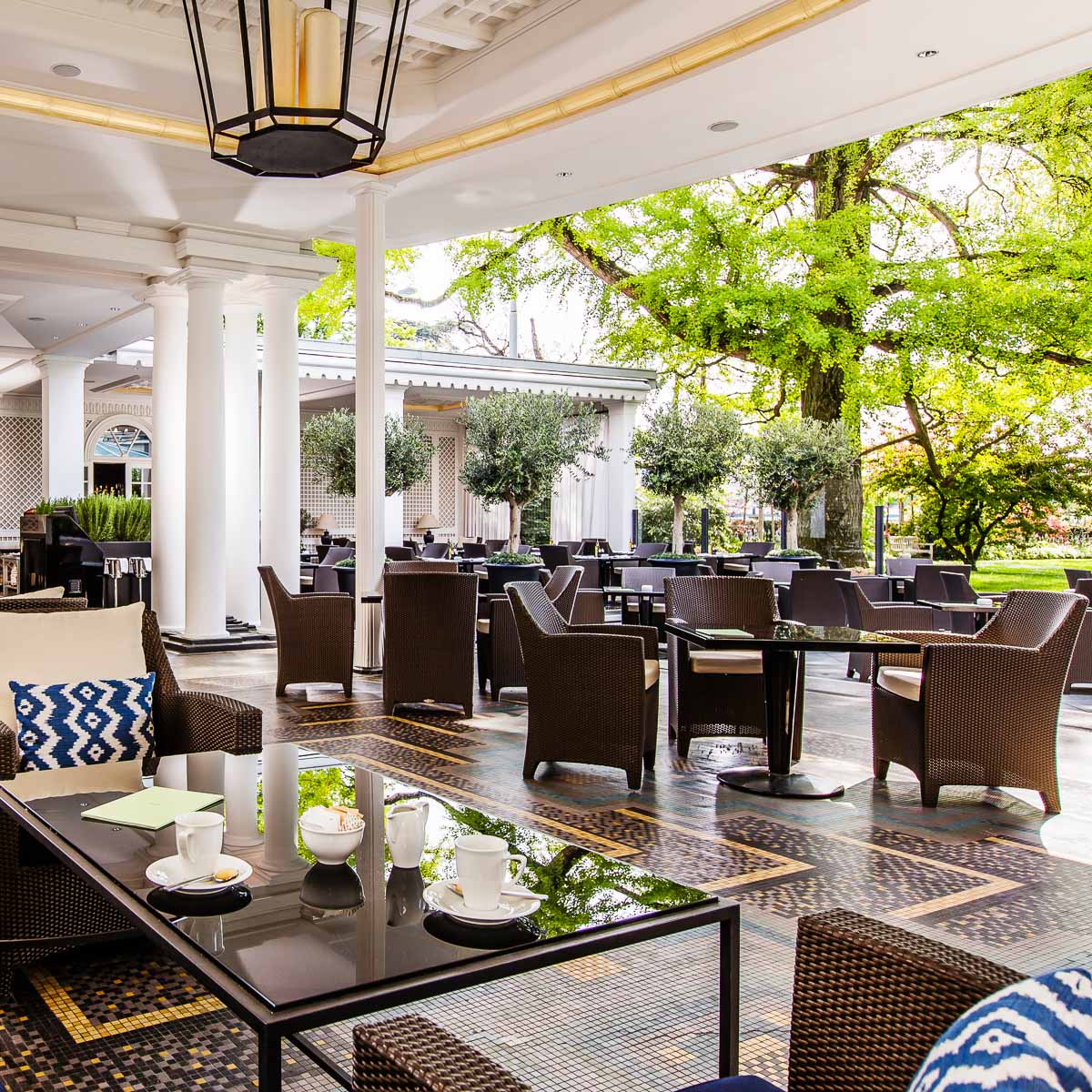 Vom Flughafen Zürich sind es keine 45 Minuten, bis ich in der geschichtsträchtigen Lobby des über 170 Jahre alten "Grand Hotels" stehe. Vor der alten Drehtür liegt verheißungsvoll die Baur's Terrasse am idyllischen Privatpark mit Blick auf den Zürichsee. Darüber ein strahlend blauer Himmel. – Ausblicke auf mondäne Stunden am Nachmittag!