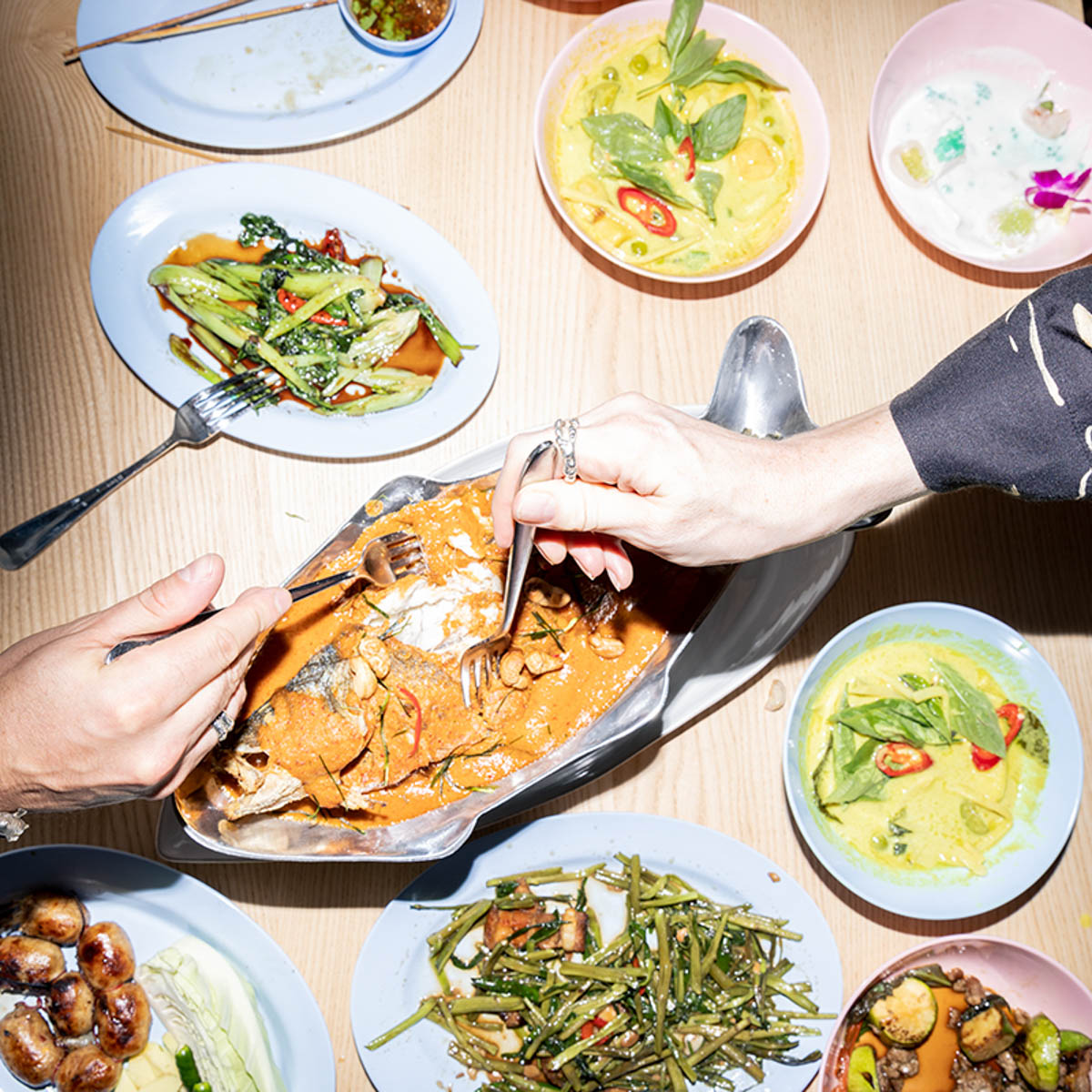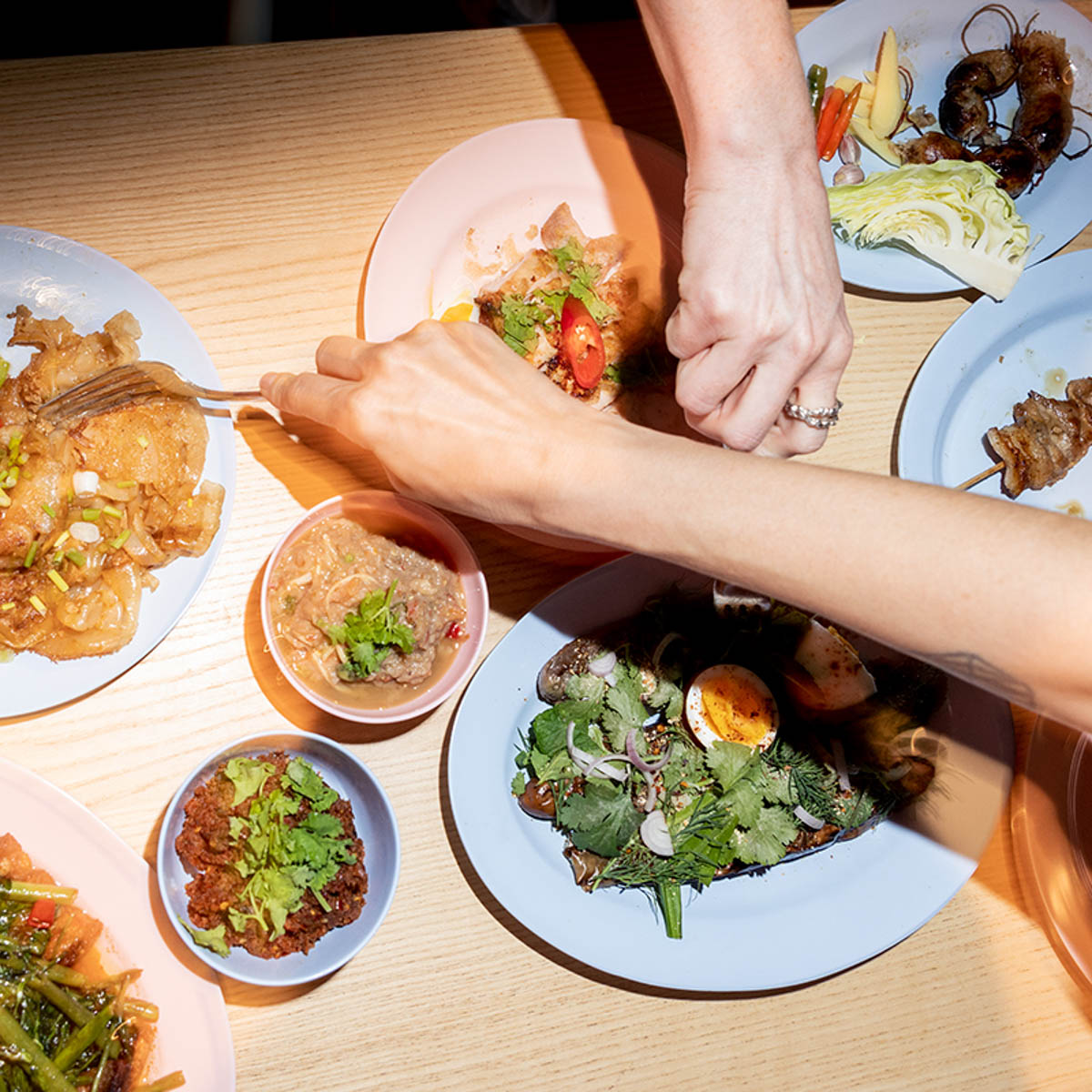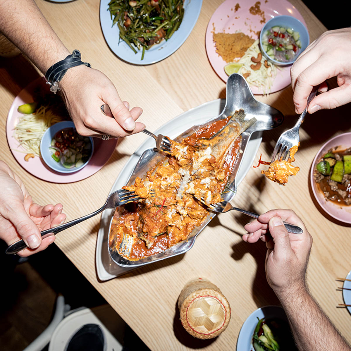 Nun bringt der ehemalige Küchenchef des Clouds im Kreis 4 fünfzehn typische Garküchengerichte wie ein Moo Ping Massaman, Schweinsspiessli mit Massaman und Röstzwiebeln oder Pad Guay Tiew, also knsuprige Reisnudeln mit Eigelb und Knoblauch, auf den Tisch. Auch scharfer Papaya-Salat mit grilliertem Poulet und Pad Pak Bung Fai Däng – Morning-Glory-Gemüse mit knusprigem Schweinebauch – oder saftige Mango auf Sticky Rice mit Sesam erinnern an Thailands warme Nächte und sonnigen Tage.