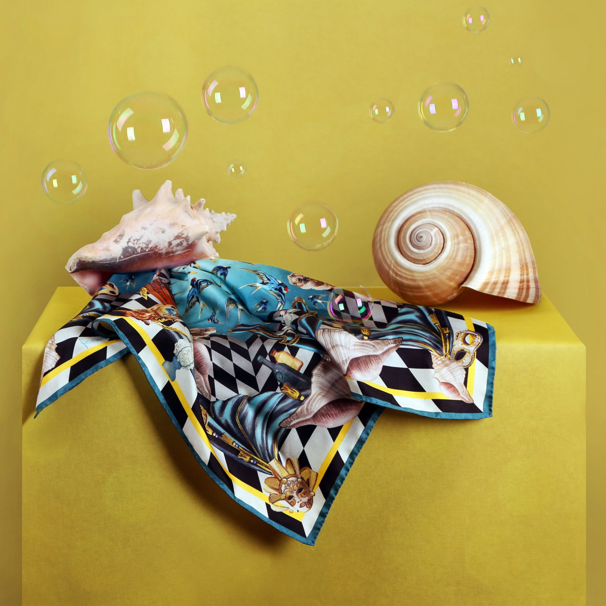 Die Carrés quellen fast über vor lauter Elementen. Wer es mal etwas diskreter mag, kann das Tuch aber auch so drapieren, dass sich nur Blumen oder Tiere zeigen. Etwas weniger exzentrisch, doch ebenso verspielt präsentieren sich ihre neuesten Prints, die sich um das Thema Reisen drehen – natürlich immer mit einem leichten Augenzwinkern. Übrigens: Den passenden Soundtrack zum Lebensgefühl von Atelier Fiona K. finden Kunden auch auf Vinyl im Shop.