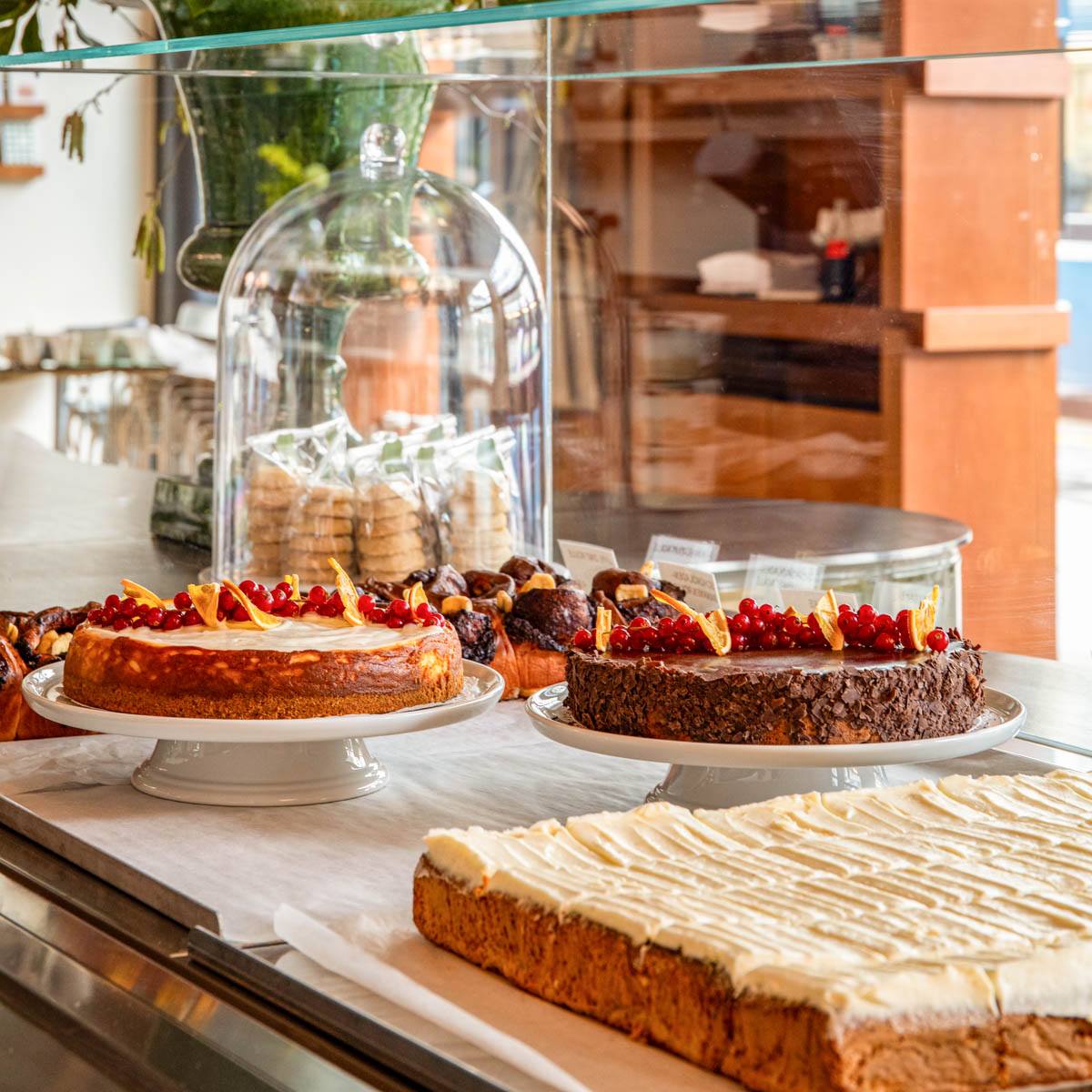 Und auch die Auslage der Verkaufstheke bietet eine üppige Auswahl an Köstlichkeiten, die das Entscheiden erschweren zwischen Cheese Cake, Mohnkuchen, Schokoladenkuchen, Himbeerschnitte, belgischen Waffeln, Spicy Oat Cookies, Rüeblikuchen, Lachs-Bagel, Biberli oder Foccacia mit Parmesan und Zucchini.