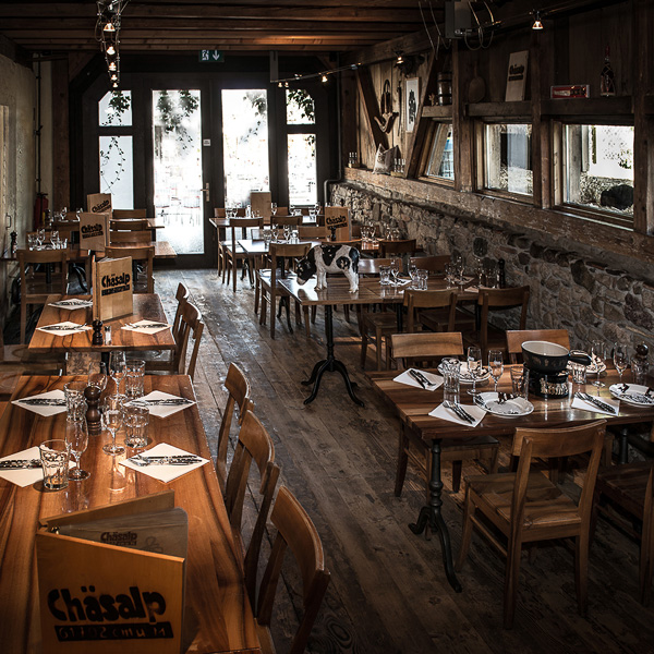 Zum "Senne Z’Morge uf dä Alp", also dem hiesigen Brunch, wird hier alles serviert, "was das Herz begehrt". Inklusive Birchermüsli, Hauskäse von der Kuh Apolla von der Tschingelfelder Alp im Berner Oberland und 180 Sekundeneier. Auf der Mittags- und Abendkarte steht Altbewährtes, darunter Maggerone Töpf, Steaks und Würste aus der Pfanne, Wurst-Käsesalat sowie etliche Raclette und Chäesfondue Variationen. Und genau dafür ist die Chäsalp mit seinen Räumlichkeiten, die in einem rustikal und gleichzeitig modernen Ambiente gehalten sind, der schönste Ort.