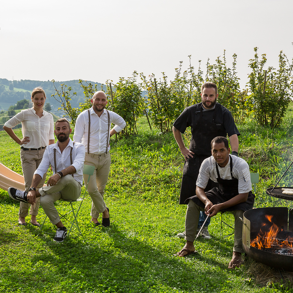 Zum modern interpretierten Menü aus unterschiedlichen regionalen Produkten, teilweise direkt vom Hof, werden lokale Weine serviert. Wir starten mit hausgemachtem Fladenbrot vom Feuer. Dazu gibt’s gesalzene Alpbutter und Salsiz. Gefolgt von der Vorspeise, einer geräuchten Forelle mit Schalottenvinaigrette, Sauerklee und Kräutersalat. Für das Rindsvoressen im Hauptgang wird das hofeigene Natura Beef verwendet.