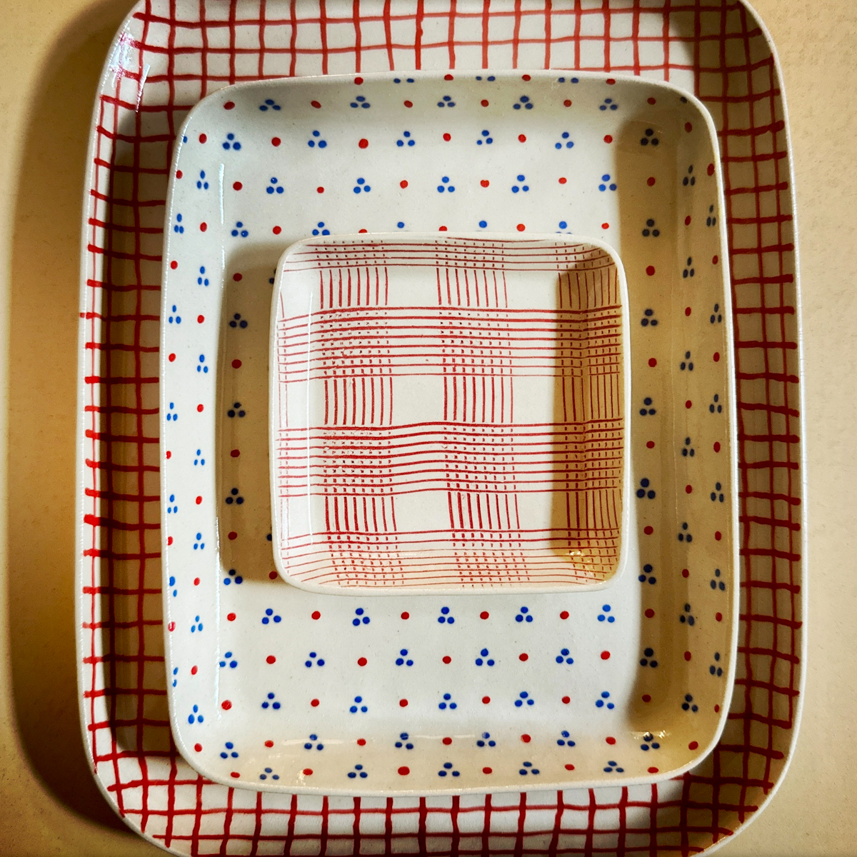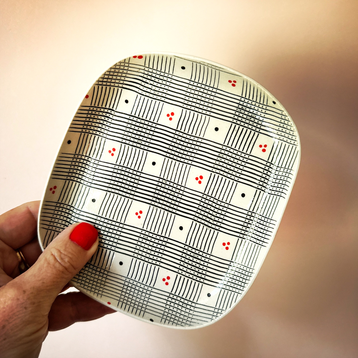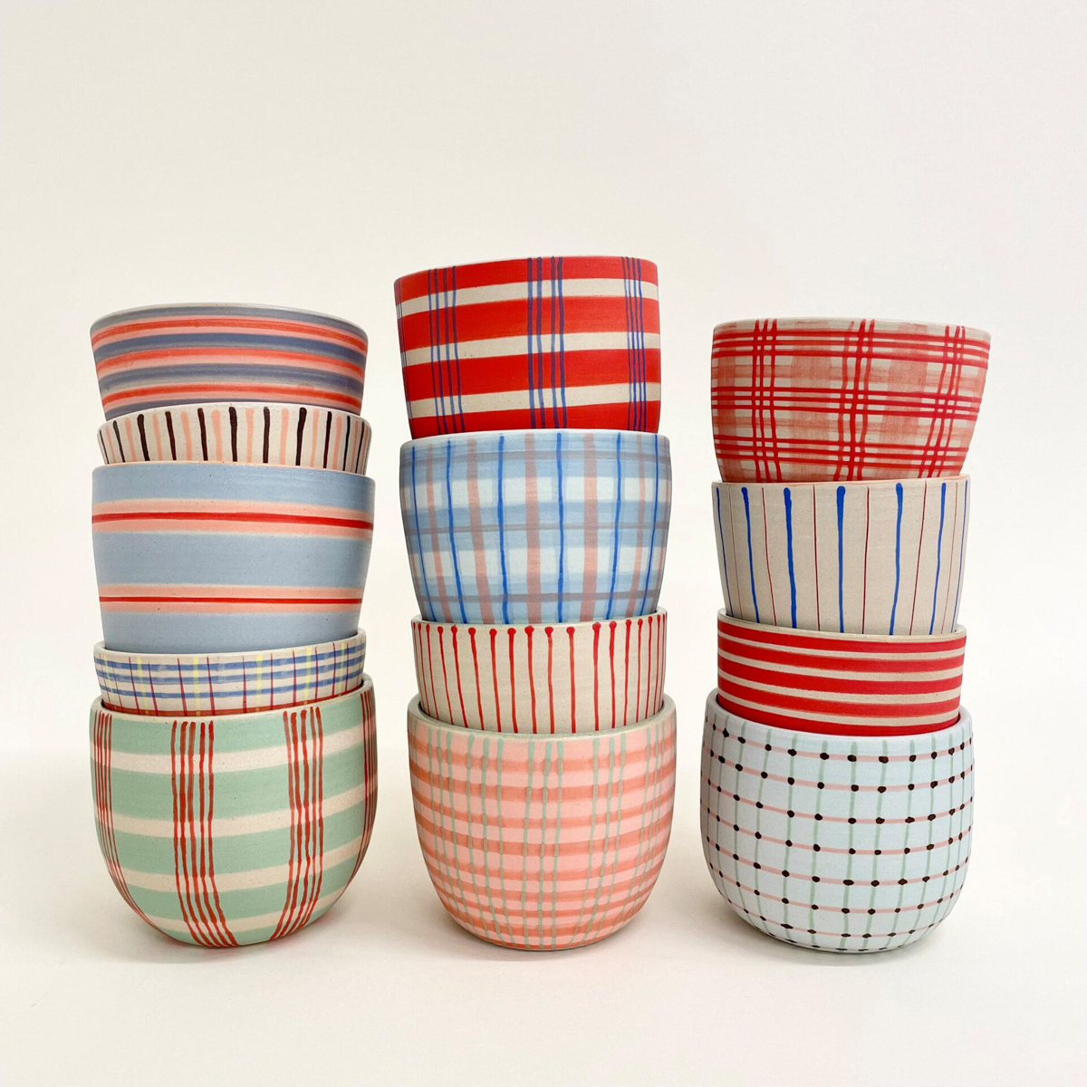 Die Oberfläche der Objekte wird nicht einfach glasiert, sondern bemalt, betupft, geritzt oder mit Mustern versehen, die an grafische Stoffe erinnern: an ein Berggasthof-Tischtuch, einen Kimono, „Block Print“-Stoffe oder ein elegantes Seidenfoulard. Diese Inspirationsquellen spiegeln sich in den meist farbigen, grafischen Mustern wider, die den Keramiken eine lebendige und zugleich zarte Präsenz geben.