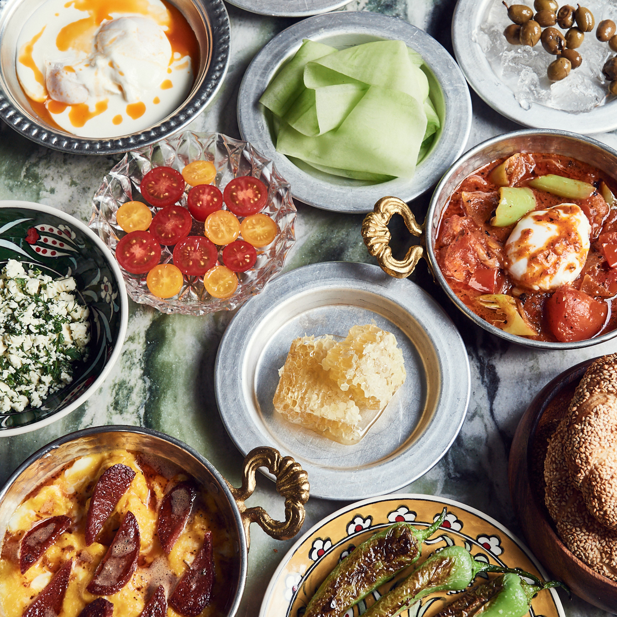 Das Restaurant selbst ist mit 88 Plätzen im Innern und ebenso vielen im begrünten Innenhof sehr weitläufig und perfekt für lange Abende mit Freunden oder Familie. Mittelpunkt des Geschehens ist die offene Küche, in der über dem Ocakbaşı-Holzkohlengrill gearbeitet wird – jener traditionellen Grilltechnik, die der anatolischen Küche ihren charakteristischen rauchigen Duft verleiht.