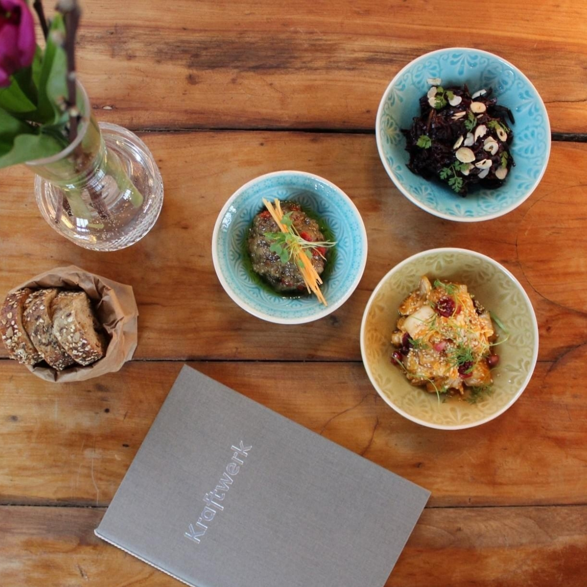 In der Menükarte des Kraftwerk steht von Salaten mit Quinoa oder Linsen und Gemüsesuppen bis hin zu lecker gefüllten Wraps oder feinen Nudelgerichten, wie beispielsweise Rigatoni mit Soja-Gehacktem, Spinat und Röstzwiebeln, viel zur Auswahl.