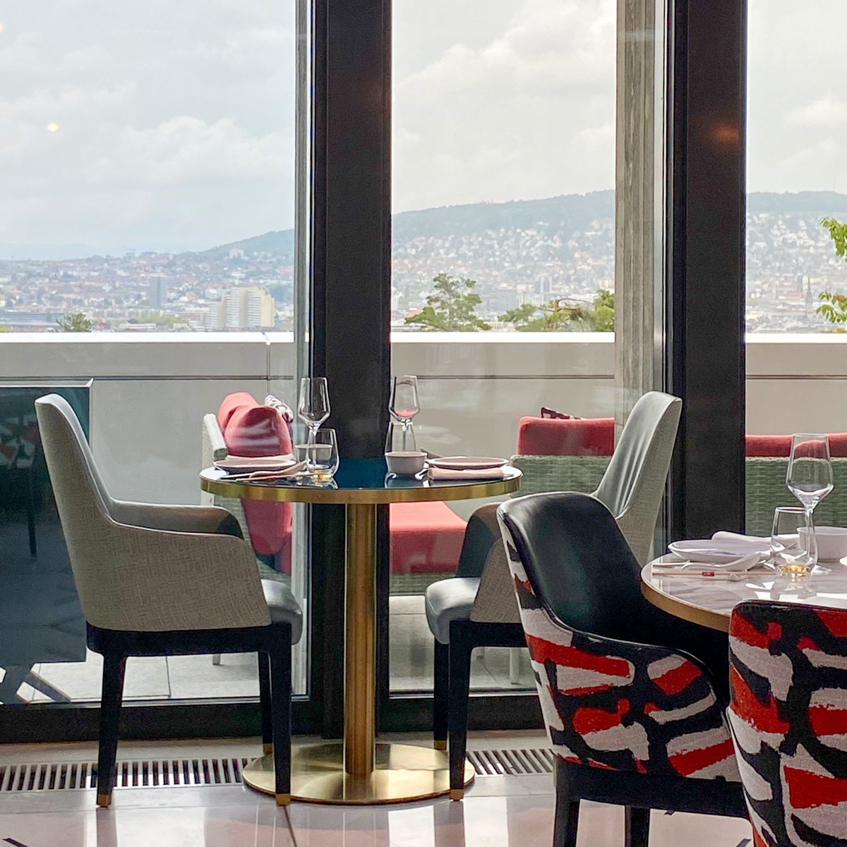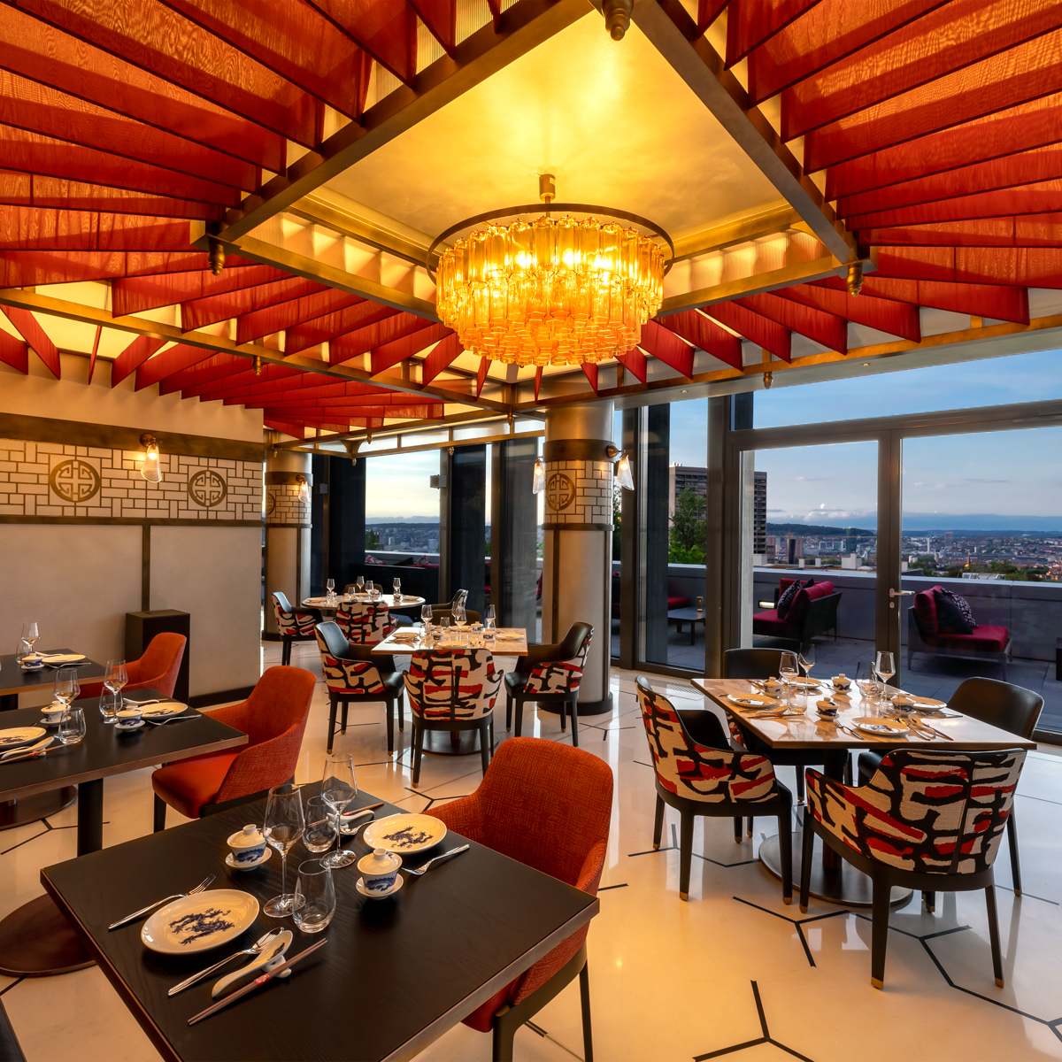 Schon die Räumlichkeiten erinnern an das vibrierende Shanghai der 1920er Jahre, eingerichtet im Art-déco-Stil mit dekorativen Ornamenten sowie einer farblich beeindruckenden Private Lounge für das Genießen im kleinen Kreis. Bei schönem Wetter ist zudem die weitläufige Außenterrasse geöffnet, die einen atemberaubenden Blick auf Zürich bietet.