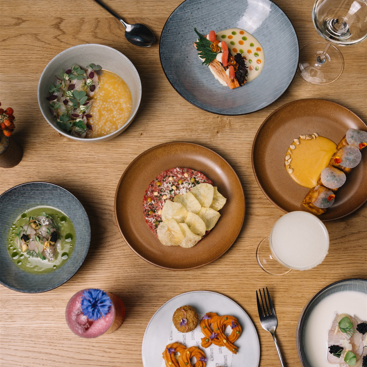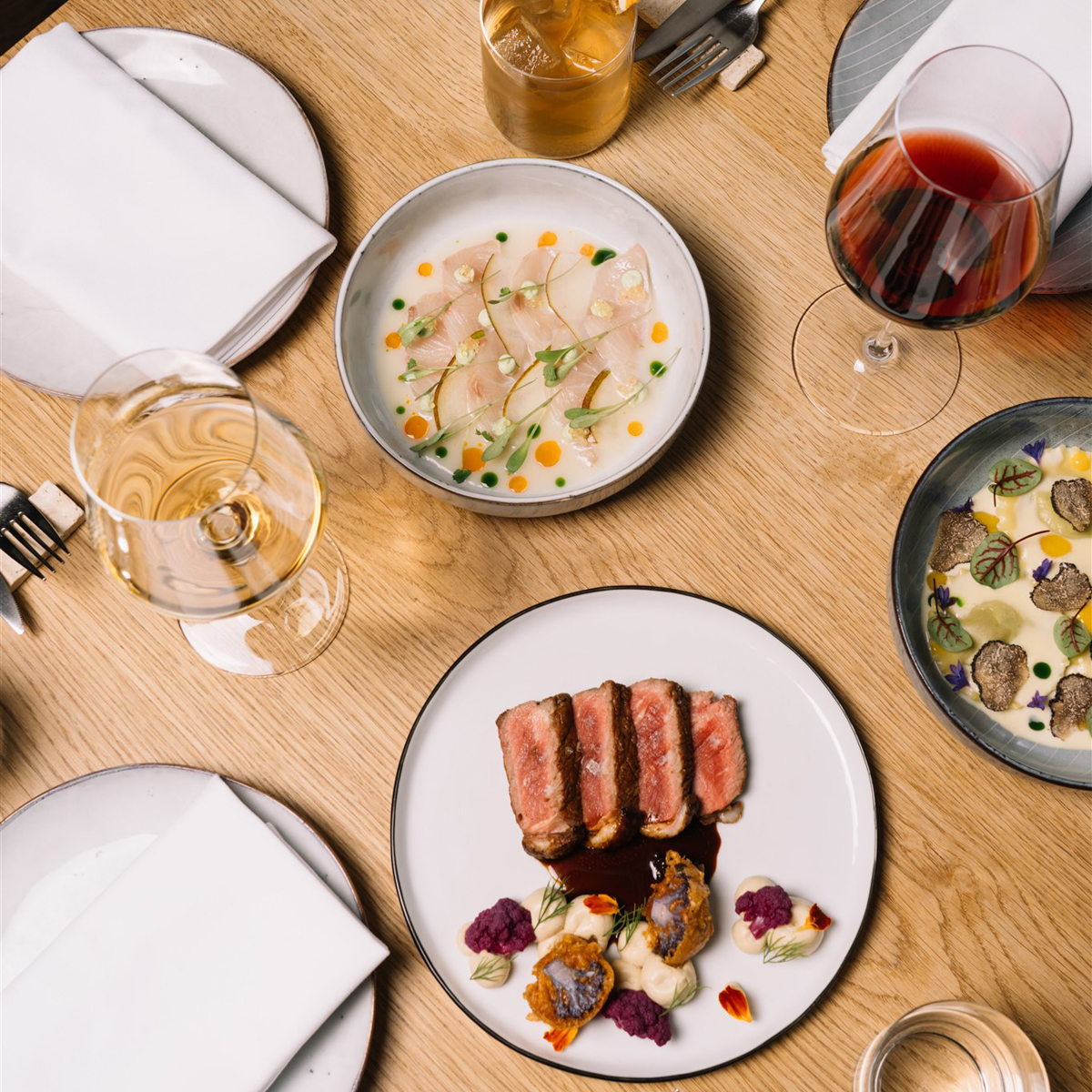 Das Tartar vom Schweizer Rind mit gepökeltem Eigelb, Trüffel und Mais-Tostada zeigt zudem, wie selbstverständlich regionale Produkte integriert werden. Auch die warmen Gerichte spielen dabei mit Kontrasten: Aubergine mit Gochujang und geräuchertem Sojajoghurt, Tacos de Molleja mit Kalbsmilken oder Heilbutt mit Ajoblanco und Ikura verbinden südamerikanische Aromen mit mediterranen und asiatischen Einflüssen.