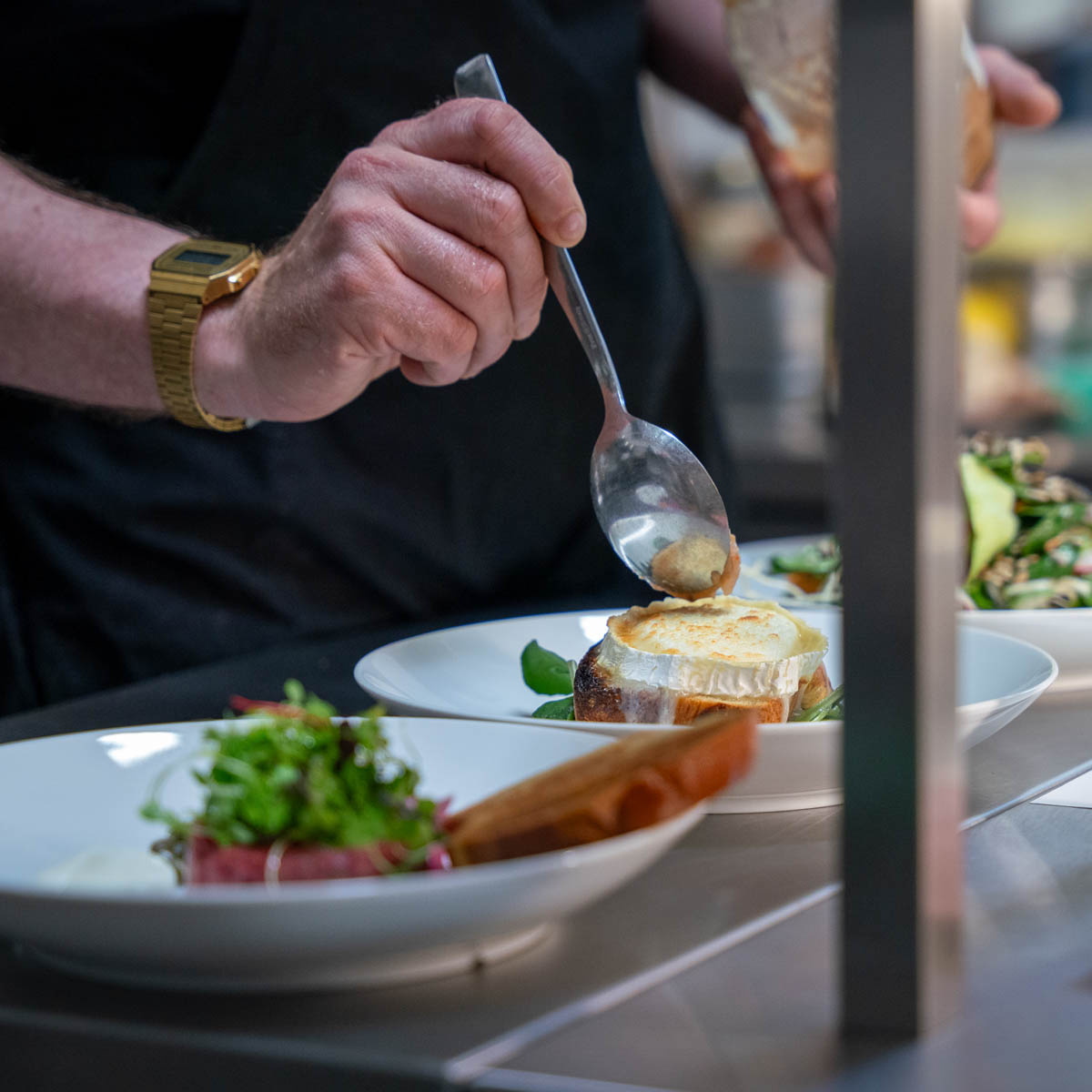 Sei es zu einem reichhaltigen Wochenendbrunch, das vom "Kleinen Zmorge" mit Brot, Zopf, Butter, Konfitüre und Granola über Stundenei mit Pilzragout, Hollandaise und Spinat bis hin zu French Toast aus Zopf mit Speck und Ahornsirup oder unterschiedlich belegter Brioche eine große Auswahl auf den Tisch bringt. Hier werden garantiert alle lieben Freunde satt.