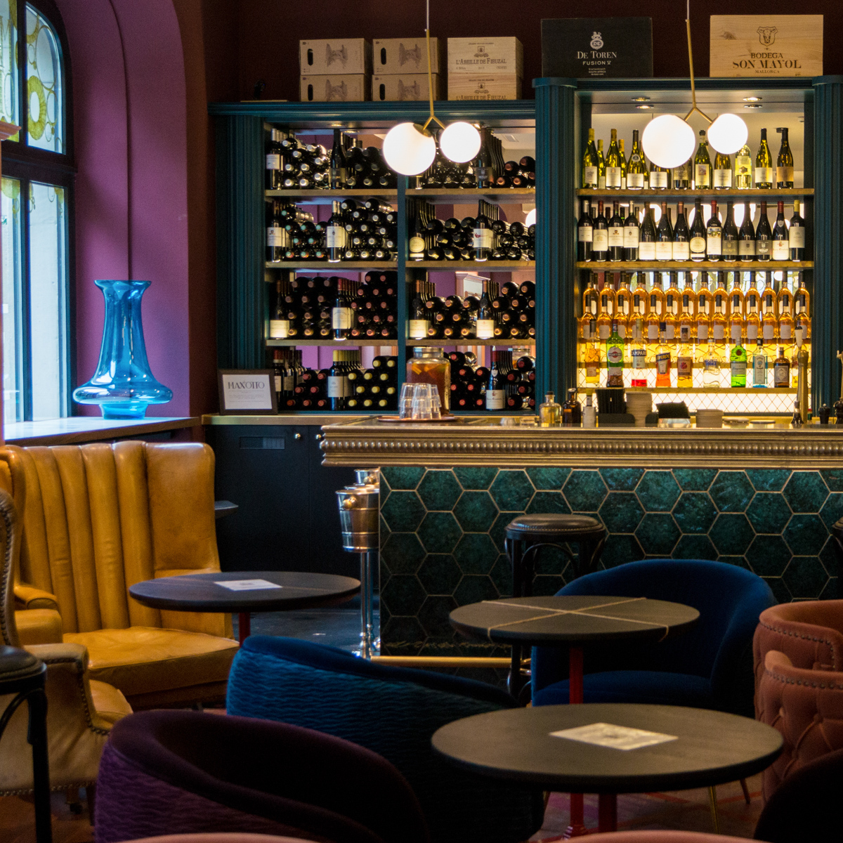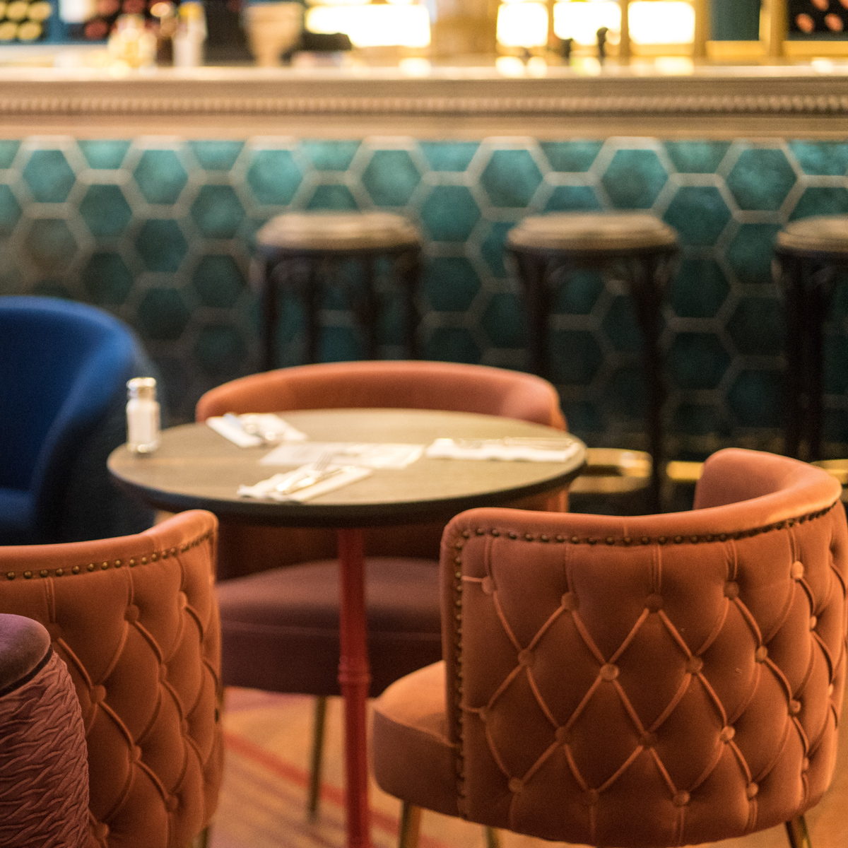 Mit Unterstützung des Amsterdamer Design Duos Adam Marshall und Teske Clijsen wurde das Max & Otto in einen Ort verwandelt, der zum Verweilen einlädt – mit gewagten Farbkombinationen und handwerklicher Finesse. Ansprechend leuchtet beispielsweise am Ende des Raumes die Bar in warm schimmernden Tönen, wo zudem ein gemütliches Sofaelement gekonnt eine Grenze zu den Sitzplätzen zieht.