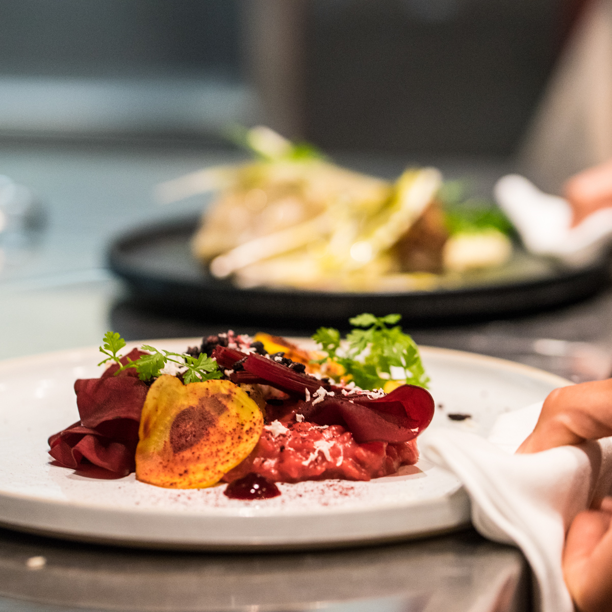 Und so geht es auch weiter. Der Kabeljau auf cremigen Selleriepüree mit Rotkohl-Brioche und Löwenzahn hinterlässt ebenso wie der Steinbutt mit auf den Punkt genau gekochten, bissfesten Randenrisotto, Apfel, Meerrettich und Basilikum ein einzigartiges Geschmackserlebnis.