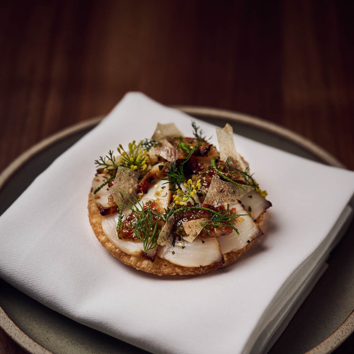 Das ginge üblicherweise an die Tische und für den Tresen gäbe es eine Barfood-Karte. Nicht so in dem entspannten Fine-Dining-Restaurant. Zum Lunch und Dinner wird groß aufgetischt. Es gibt „nur“ ein Tastingmenü in 17 (!) Akten im japanischen Omakase Stil: Der Koch entscheidet, was auf die Teller kommt.