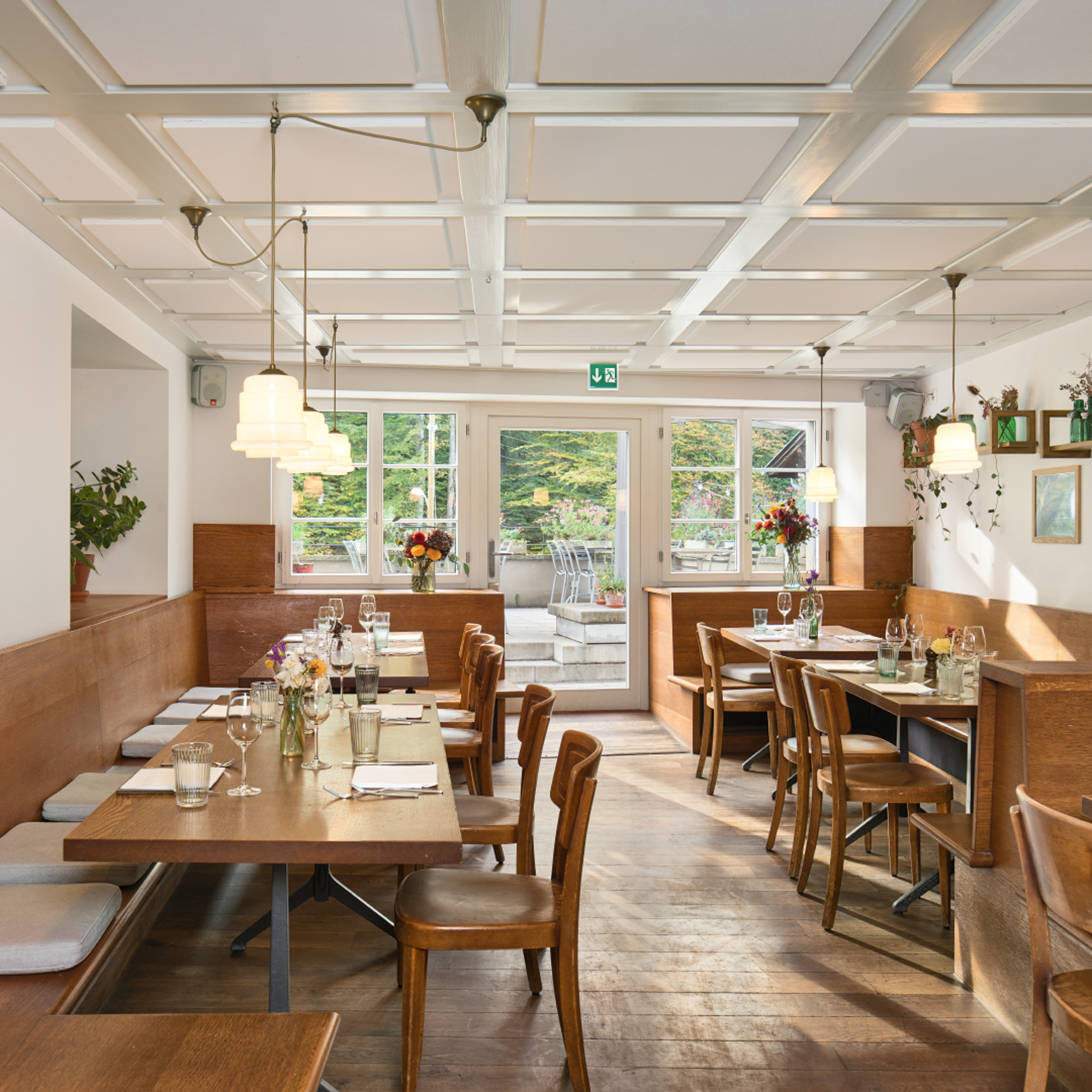 Die zarte Rehtagliata mit Felsenbirnen-Chutney und Griesschnitte verführt ebenso wie die saftigen Short Ribs vom Bio-Rind mit pikanter BBQ-Sauce und Quetschkartoffeln. Natürlich sind hier auch die wohlbekannten Klassiker einer Gartenbeiz zu finden wie Cordonbleu vom Bio-Säuli mit Rotkohlpickles und knusprigen Pommes Frites sowie unwiderstehliches Zürcher Kalbsgeschnetzeltes mit Rösti. Serviert werden dazu Schweizer Weine oder ausgesuchte Weine aus dem nahen Ausland.