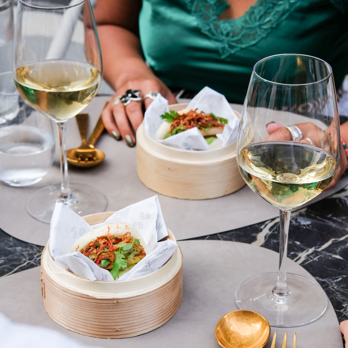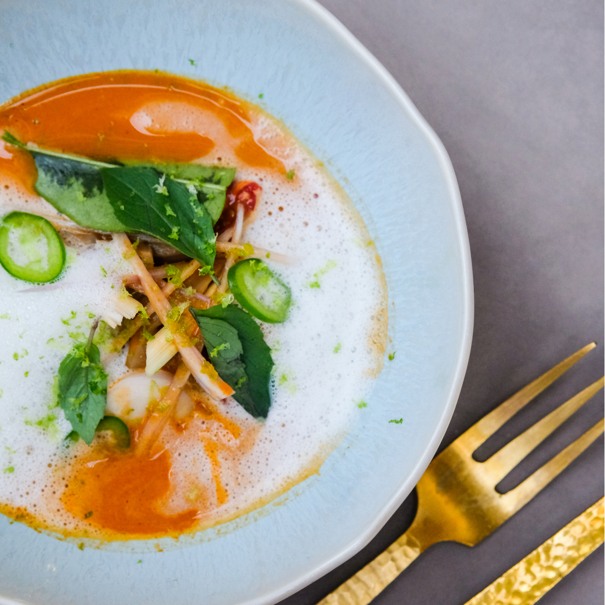 Das ‘Asian Summer Night’ Menü bringt zum Auftakt das Spanferkel-Gericht Bao Bun auf den Tisch, mit Koriander gewürzt und begleitet von einem scharfen Coleslaw. Weiter geht es mit einem Thai Ceviche mit Lachs, Kopfsalat und Pomelo, gekrönt mit etwas Kaviar, danach überrascht feinste Langustino und Jacobsmuschel à la ‘Tom Yum Style’, aromatisiert mit Zitronengras, Tomate und Kaffir Limette.