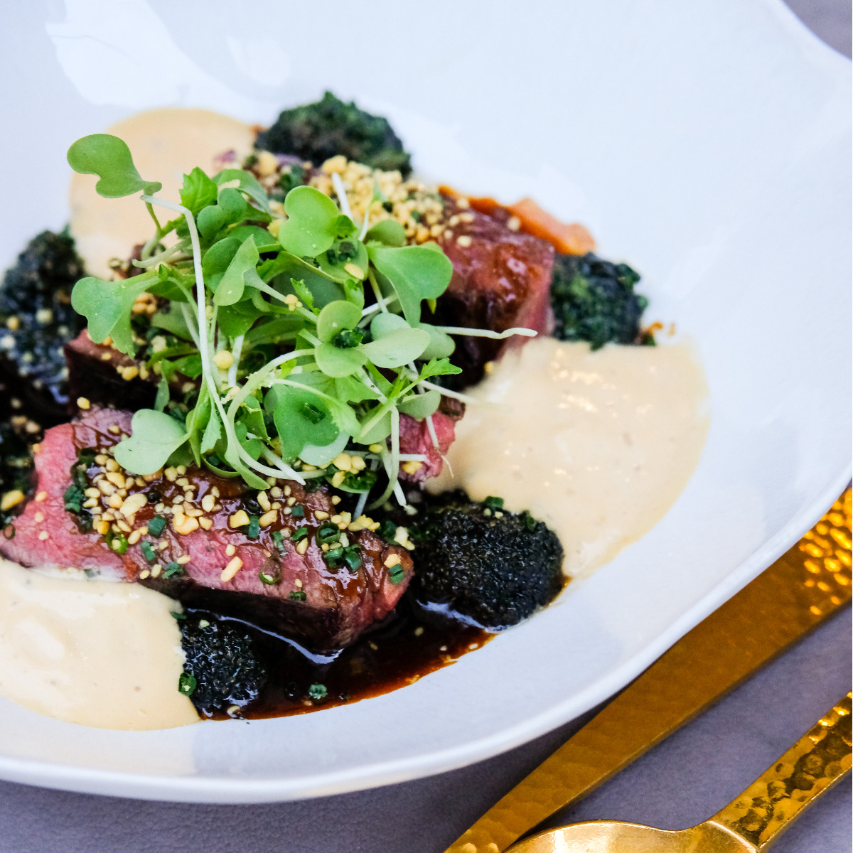 Es folgt zartes australische Wagyu Rind mit wildem Brokkoli, Yuzu und BBQ Lack zusammen mit schwarzem Wintertrüffel und leitet über zum feinen Dessert, bestehend aus einem leichten Softeis ‘Deluxe’, in dem Kokusnuss, Erdbeere und Kalamansi den finalen Abschluss bilden. Für Vegetarier gibt es ein abgewandeltes Menü, das mit knuspriger Zucchini, Austernpilzen und Süsskartoffeln sowie Kichererbsen eine variantenreiche Alternative bietet.